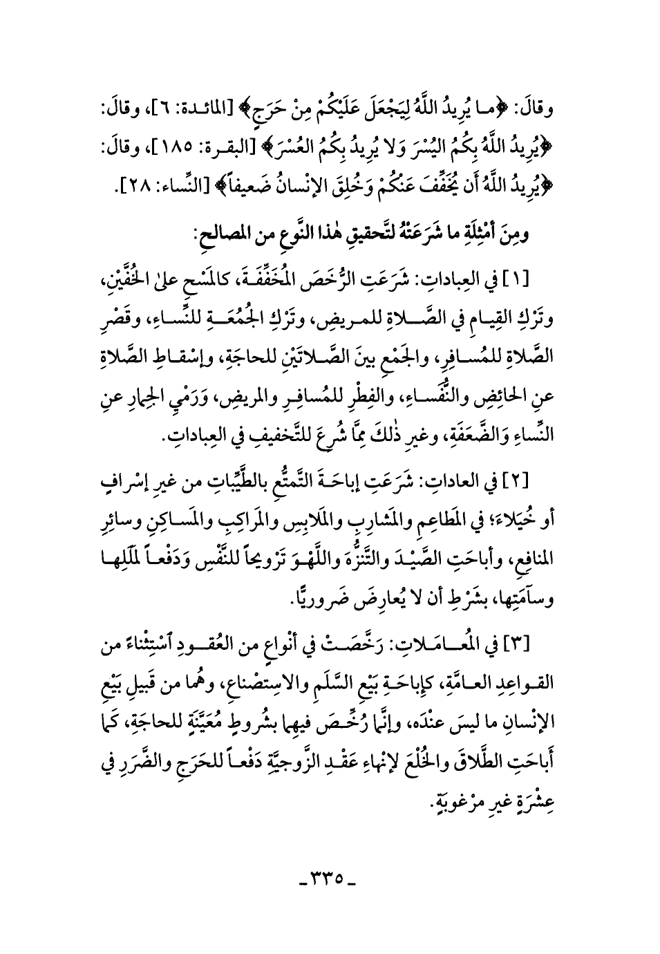 [1] في العباداتِ: شرعتِ الرُّخصَ المُخفَّفةَ، كالمسحِ على الخُفَّينِ، وتركِ القيامِ في الصَّلاةِ للمسافرِ، والجمعِ بين الصَّلاتينِ للحاجَةِ، وإسقاطِ الصَّلاةِ عن الحائضِ والنُّفساءِ، والفِطرِ للمسافرِ والمريضِ، ورميِ الجِمارِ عن النِّساءِ والضَّعفَةِ، وغير ذلك ممَّا شُرع للتَّخفيفِ في العبادَاتِ.