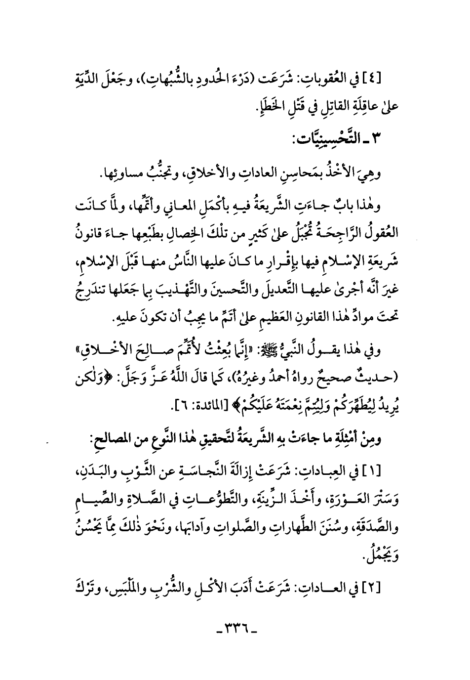 وهذا بابٌ جاءتِ الشَّريعةُ فيه بأكملِ المعاني وأتمِّهَا، ولمَّا كانت العقُولُ الرَّاجِحةُ تُجبلُ على كثيرٍ من تلكَ الخِصالِ بطَبْعِها جاء قَانُونُ شريعةِ الإسلامِ فيها بإقرارِ ما كانَ عليها النَّاسُ منها قبلَ الإسلامِ، غيرَ أنَّه أجرَى عليها التَّعديلَ والتَّحسينَ والتَّهذيبَ بما جعلَتْها تندرجُ تحتَ موادِّ هذا القانونِ العظيمِ على أتمِّ ما يجبُ أن تكونَ عليهِ.
