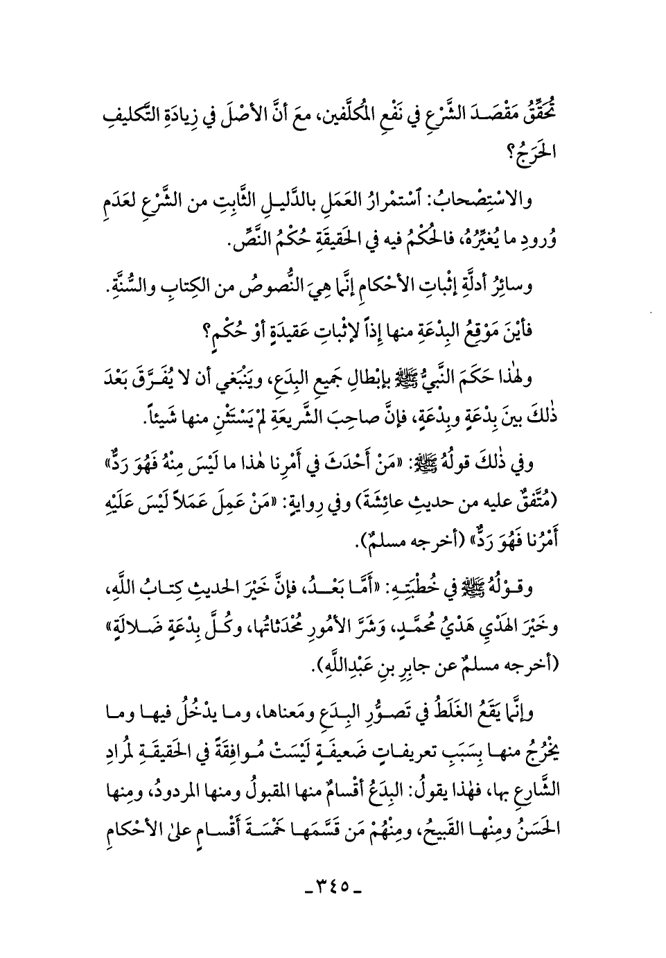 وفي ذلكَ قوله - صلى الله عليه وسلم -: ((من أحدثَ في أمرنَا هذا ما ليسَ منهُ فهوَ رّدٌّ)) [متفقٌ عليه من حديث عائشةَ] وفي روايةٍ: ((من عملَ عملاً ليس عليهِ أمرُنا فهو ردٌّ)) [أخرجه مسلمٌ] .