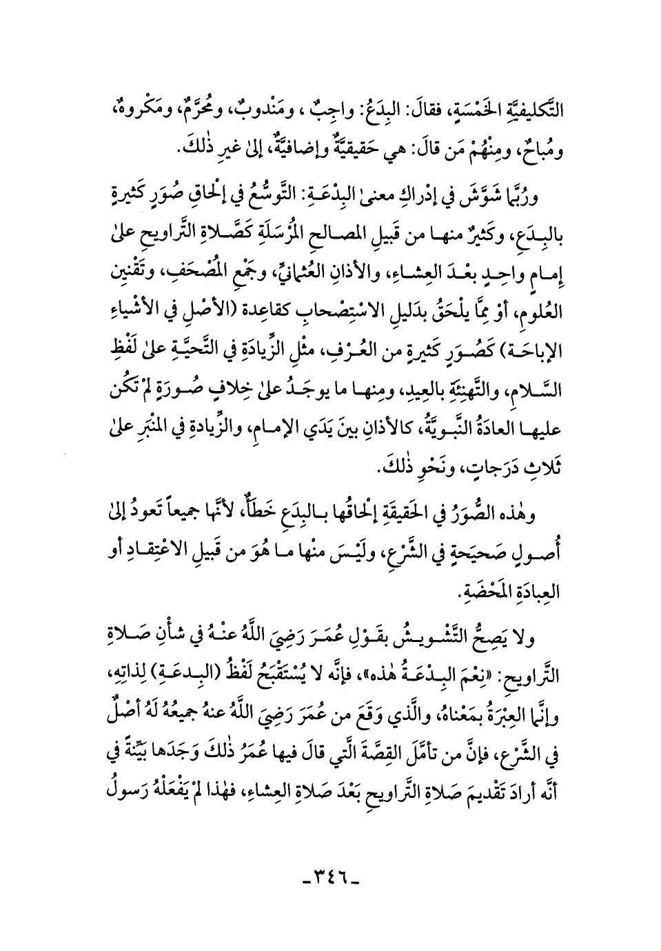 التَّكليفيَّة الخمسة، فقالَ: البِدعُ: واجبٌ، ومندوبٌ، ومُحرَّمٌ، ومكروهٌ، ومباحٌ، ومنهم من قال: هي حقيقةٌ وإضافيَّةٌ، إلى غير ذلكَ.