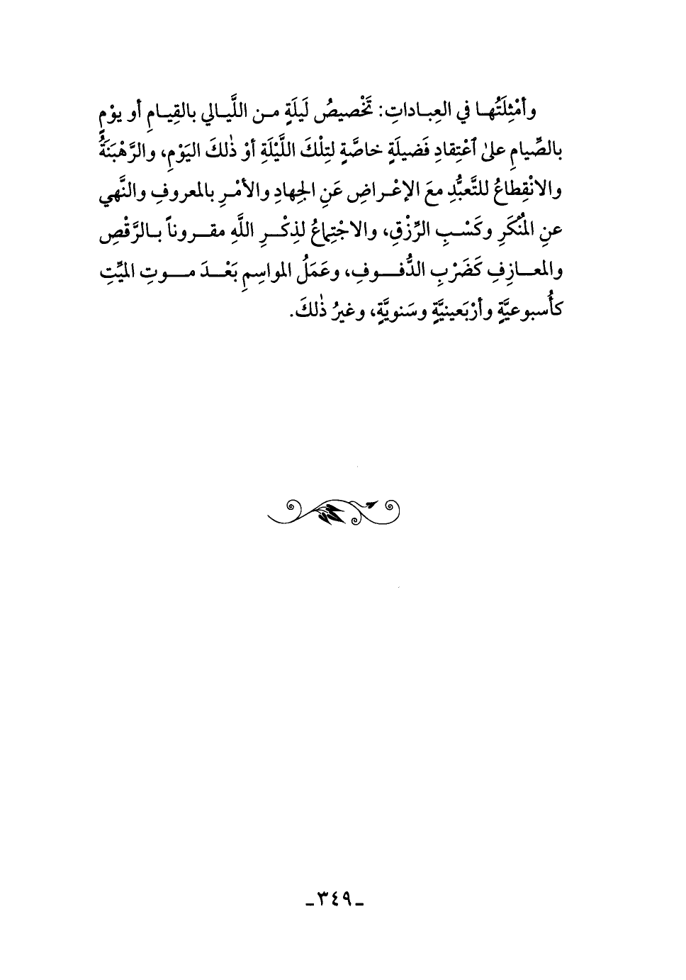 وأمثلتُهَا في العبادَاتِ: تخصيصُ ليلةٍ من اللَّيالي بالقيامِ أو يومٍ بالصِّيامِ على اعتقادِ فضيلةٍ خاصَّةٍ لتلكَ اللَّيلةِ أو ذلكَ اليومِ، والرَّهبَنةُ والانقِطاعُ للتَّعبُّدُ مع الإعراضِ عن الجهادِ والأمرِ بالمعروفِ والنَّهي عن المُنكرِ وكسبِ الرِّزقِ، والاجتِماعُ لذكرِالله مقرونًا بالرَّقصِ والمعازفِ كضربِ الدُّفوفِ، وعملُ المواسمِ بعدَ موتِ الميتِ، كأُسبُوعيَّةٍ، وأربعينيَّةٍ وسنويَّةٍ، وغيرُ ذلكَ.