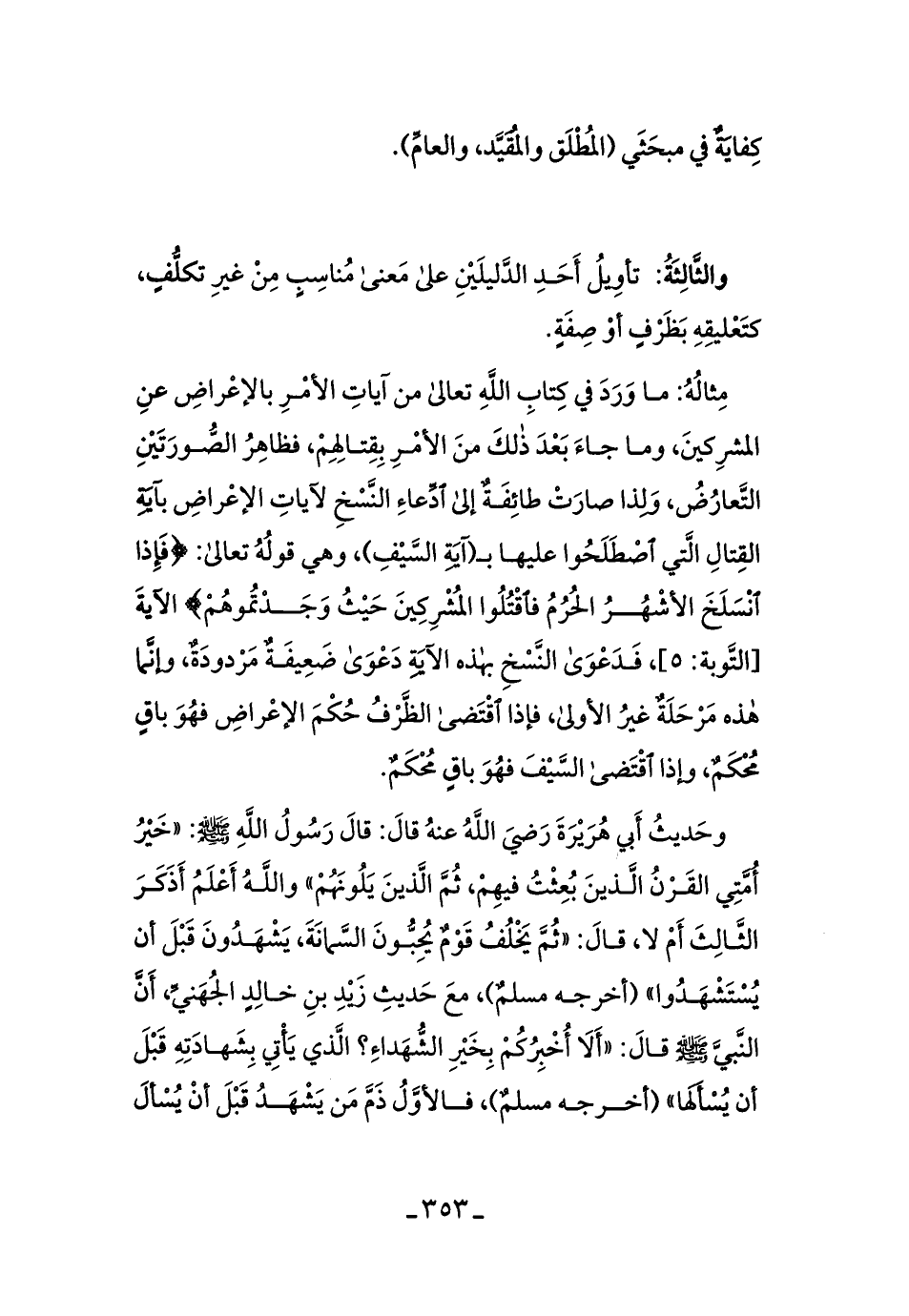 مثالهُ: ما وردَ في كتابِ الله تعالى من آياتِ الأمرِ الإعراضِ عن المشركينَ، وماجاءَ بعد ذلكَ من الأمرِ بقتالِهِم، فظاهرُ الصُّورَتينِ التَّعارضُ، ولذا صارتْ طائفةٌ إلى ادِّعاءِ النَّسخِ لآياتِ الإعراضِ بآيةِ القتالِ الَّتي اصطلحُوا عليها بـ (آية السَّيفِ) وهي قوله تعالى: {فَإِذَا انْسَلَخَ الْأَشْهُرُ الْحُرُمُ فَاقْتُلُوا الْمُشْرِكِينَ حَيْثُ وَجَدْتُمُوهُمْ} الآية [التوبة:5] ، فدعوى النَّسخِ بهذه الآيةِ دعوى ضعيفةٌ مردودةٌ، وإنَّما هذه مرحلَةٌ غيرُ الأولى، فإذا اقتضى الظَّرفُ حكمَ الإعراضِ فهو باقٍ مُحكمٌ، وإذا اقتضى السَّيفُ فهو باقٍ مُحكمٌ.