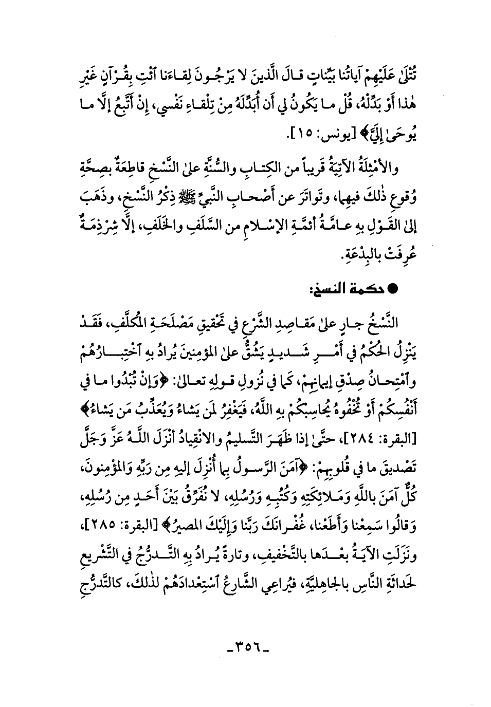 والأمثلةُ الآتية قريبًا من الكتابِ والسُّنَةِ على النسخِ قاطعةٌ بصحَّةِ وقوعِ ذلكَ فيهمَا، وتواترَ عن أصحابِ النَّبيِّ - صلى الله عليه وسلم - ذِكرُ النَّسخِ، وذهبَ إلى القولِ به عامَّةُ أئمَّةِ الإسلامِ من السَّلفِ والخلفِ، إلاَّ شِرذِمَةٌ عُرفتْ بالبِدعَةِ.