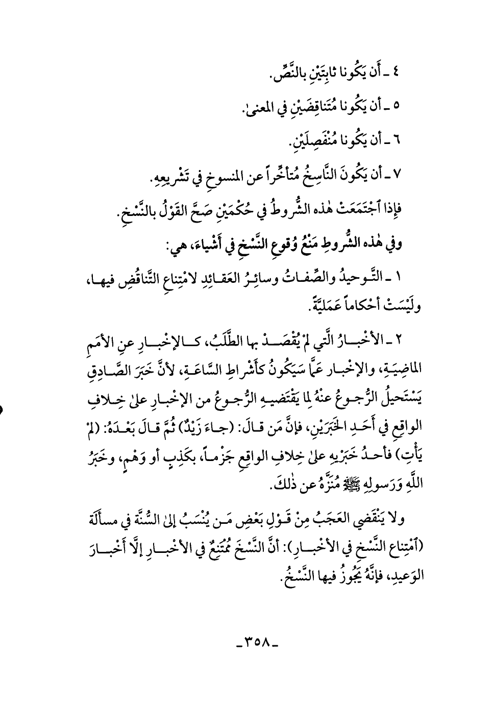 وفي هذه الشُّروطِ منعُ وقوعِ النَّسخِ في أشياءَ، هيَ: