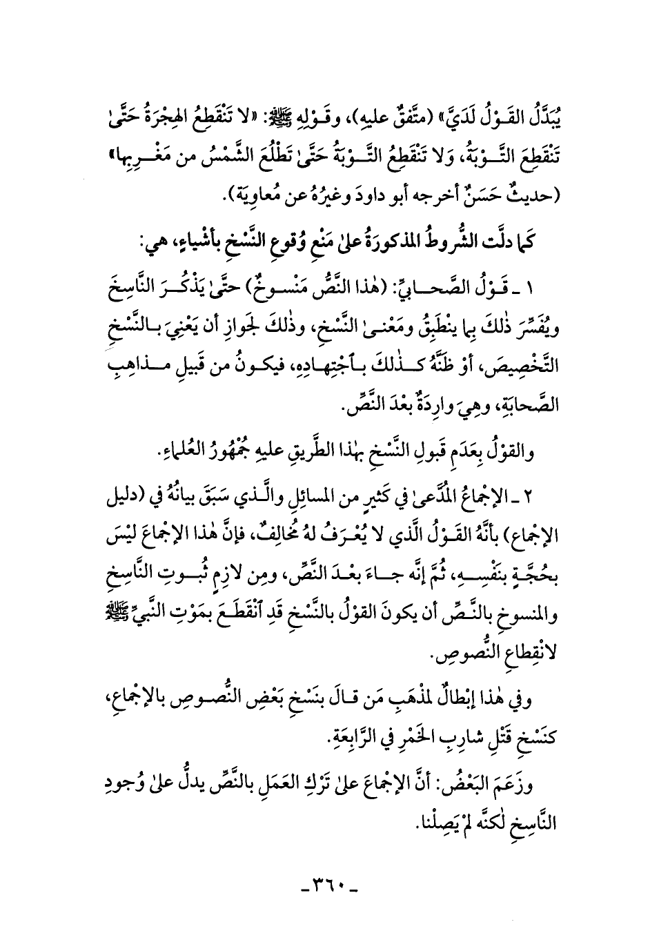 2ـ الإجماعُ المُدَّعى في كثيرٍ من المسائلِ والَّذي سبقَ بيانُه في (دليل الإجماع) بأنَّه القولُ الَّذي لا يُعرفُ لهُ مخالفٌ، فإنَّ هذا الإجماعَ ليسَ بحُجَّةٍ بنفسِهِ، ثمَّ إنه جاءَ بعد النَّصِّ، ومن لازِمٍ ثُبوتِ النَّاسخِ والمنسوخِ بالنَّصِّ أن يكونَ القولُ بالنَّسخِ قدِ انقطَعَ بموتِ النَّبيِّ - صلى الله عليه وسلم - لانقطاعِ النُّصوصِ.