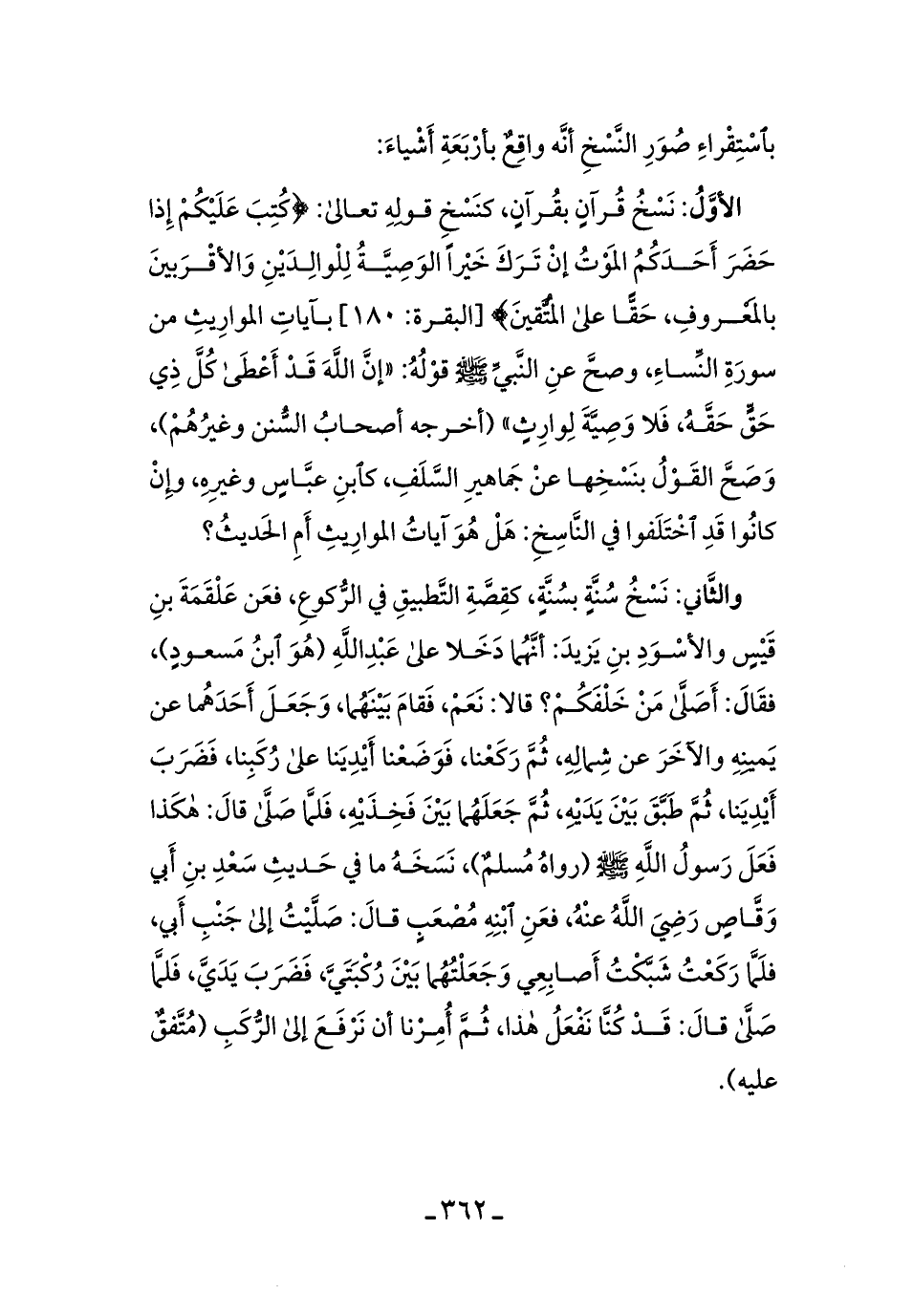 والثَّاني: نسخُ سنَّةٍ بسنَّةٍ، كصفَةِ التَّطبيقِ في الرُّكوعِ، فعنْ علقَمَةَ بنِ قيسٍ والأسودِ بنِ يزيدَ: أنَّهما دخلاَ على عبد الله (هُو ابنُ مسعودٍ) ، فقالَ: أصلَّى من خلفَكُم؟ قالاَ: نعَمْ، فقامَ بينهُمَا، وجعلَ أحدَهُما عن يمينهِ والآخرَ عن شمالِهِ، ثمَّ ركعنَا، فوضَعنَا أيدينَا على رُكبِنَا، فضرَبَ أيدينَا، ثمَّ طبَّق بين يديهِ، ثمَّ جعلهُما بينَ فخِذيهِ، فلمَّا صلَّى قالَ: هكذا فعلَ رسولُ الله - صلى الله عليه وسلم -: [رواه مسلمٌ] ، نسخَهُ ما في حديث سعدِ بن أبي وقَّاصٍ رضي الله عنهُ، فعنِ ابنِهِ مُصعبٍ قالَ: صلَّيتُ إلى جنبِ أبي، فلمَّا ركعتُ شبَّكتُ أصابِعِي وجعلتُهُما بينَ رُكبتيَّ، فضرَبَ يديَّ، فلمَّا صلَّى قالَ: قدْ كُنَّا نفعلُ هذا، ثمَّ أُمرنَا أن نرفَع إلى الرُّكبِ [متفقٌ عليه] .