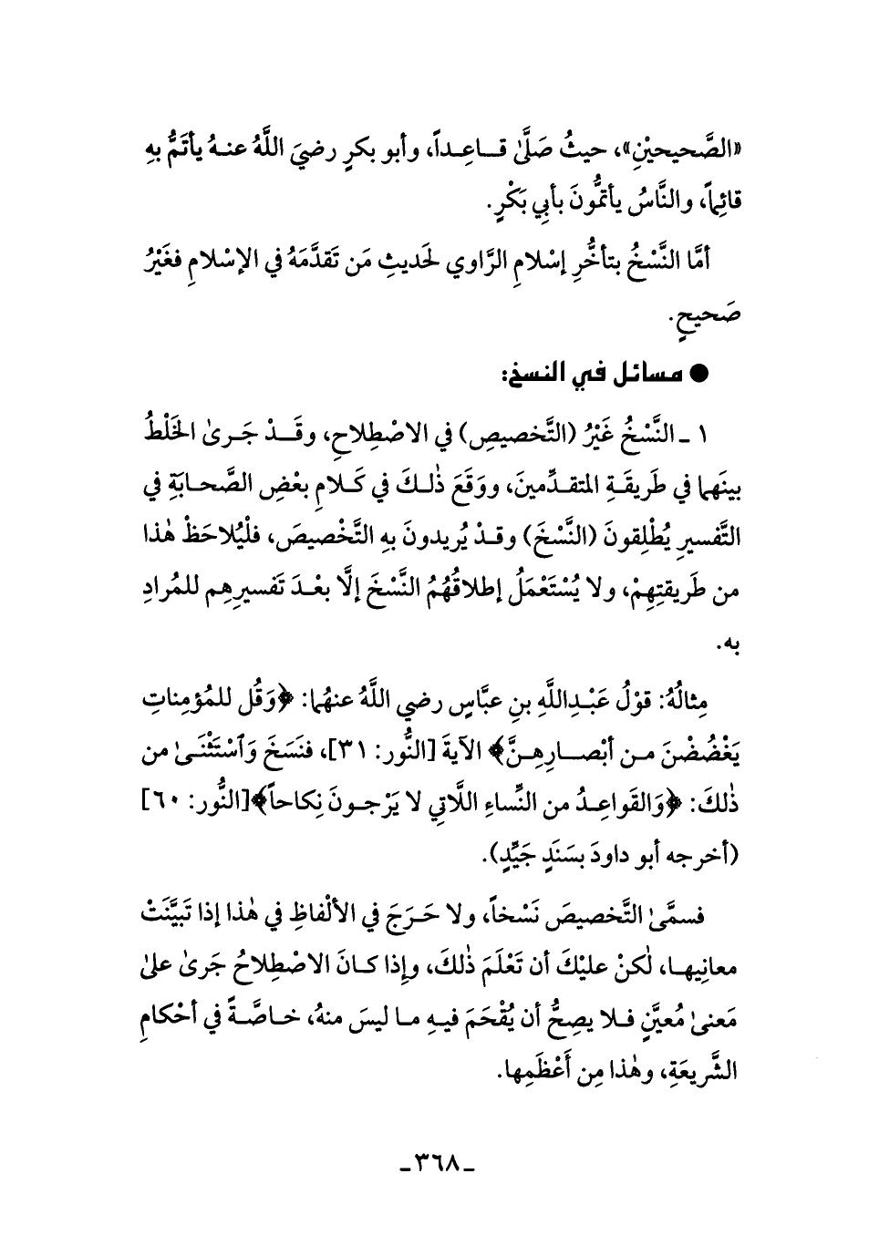 فسمَّى التَّخصيصَ نسخًا، ولا حرَجَ في الألفاظِ في هذا إذا تبيَّنتْ معانيهَا، لكنْ عليكَ أن تعلمَ ذلكَ، وإذا كانَ الاصطِلاحُ جرَى على معنَى مُعيَّنٍ فلا يصحُّ أن يُقحَمَ فيه ما ليسَ منهُ، خاصَّةً في أحكامِ الشَّريعَةِ، وهذا من أعظمِهَا.