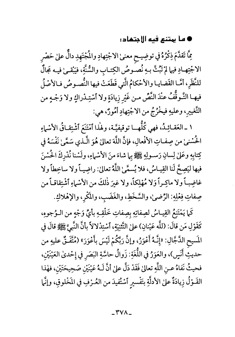 ممَّا تقدَّم ذكرُه في توضيحِ معنى الاجتهادِ والمُجتهد دالٌّ على حصرِ الاجتهادِ فيما لم تبتَّ به نصوصُ الكتابِ والسُّنَّة، فيبقى فيه مجالٌ للنَّظرِ، أمَّا القضايا والأحكامُ الَّتي قطعتْ فيها النُّصوصُ فالأصلُ فيها التَّوقُّفُ عند النَّصِّ من غيرِ زيادةٍ ولا استدراكٍ ولا وجهٍ من التَّغيير، وعليه فيخرُج من الاجتهادِ أمورٌ، هيَ: