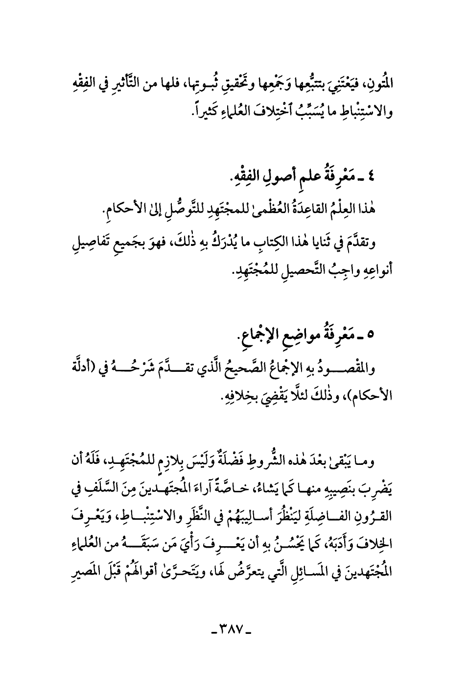 وما يبقَى بعدَ هذهِ الشُّروطِ فضلَةٌ وليسَ بلاَزِمٍ للمُجتهِدِ، فلهُ أن يضرِبَ بنصِيِهِ منهَا كما يشاءُ، خاصَّةً آراءَ المُجتهدِينَ من السَّلفِ في القُرونِ الفاضلَةِ لينظُرَ أساليبَهُم في النَّظرِ والاستِنباطِ، ويعرفَ الخلافُ وأدبَهُ، كما يحسُنُ به أن يعرفَ رأيَ من سبقهُ من العُلماءِ المُجتهدينَ في المسائلِ الَّتي يتعرَّضُ لها، ويتحرَّى أقوالَهُم قبلَ المصيرِ