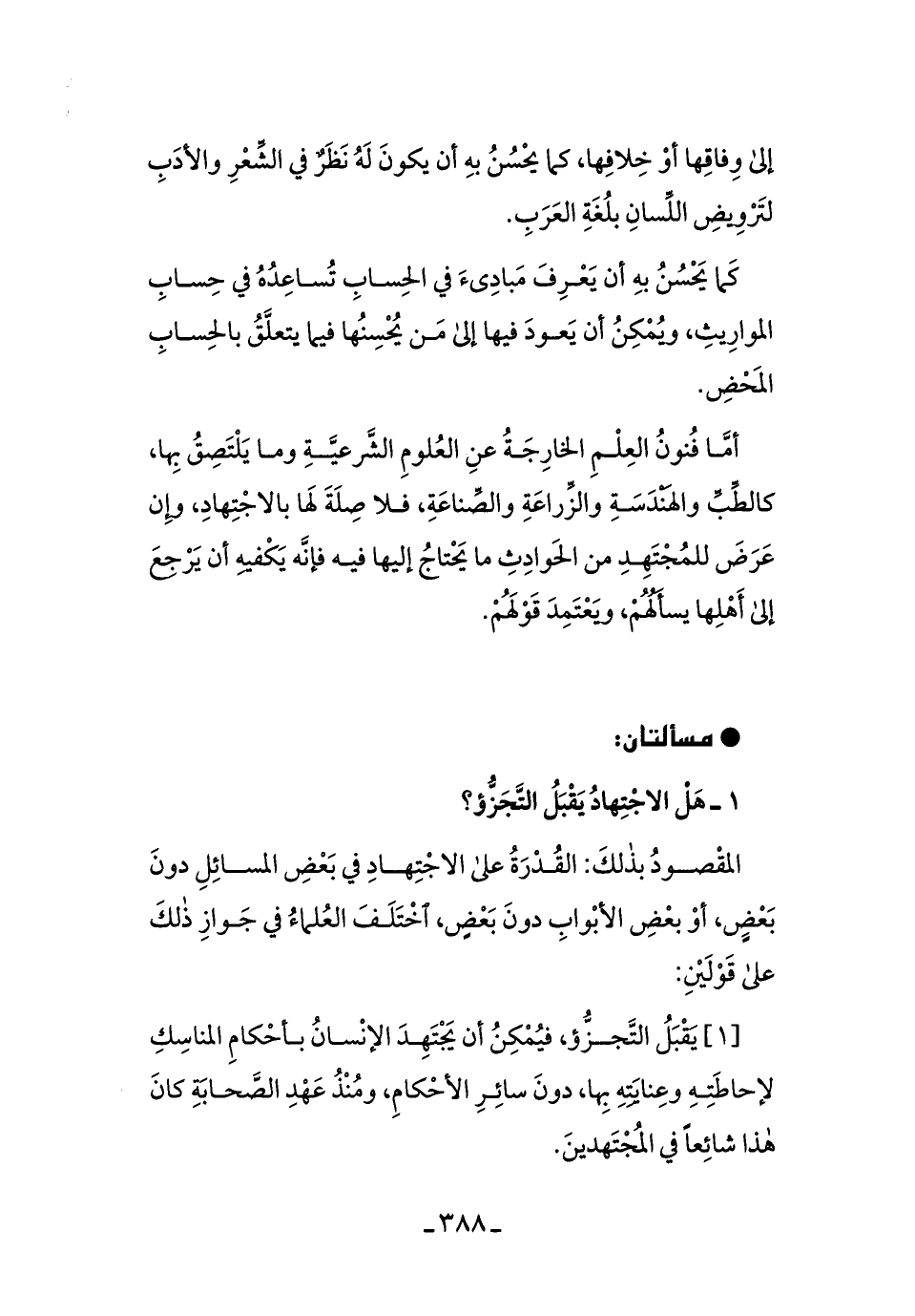 [1] يقبلُ التَّجزُّؤ، فيُمكنُ أن يجتهدَ الإنسانُ بأحكامِ المناسِكِ لإحاطتِهِ وعنايَتِه بها، دون سائرِ الأحكامِ، ومنذُ عهدِ الصَّحابةِ كانَ هذا شائعًا في المجتهدينَ.