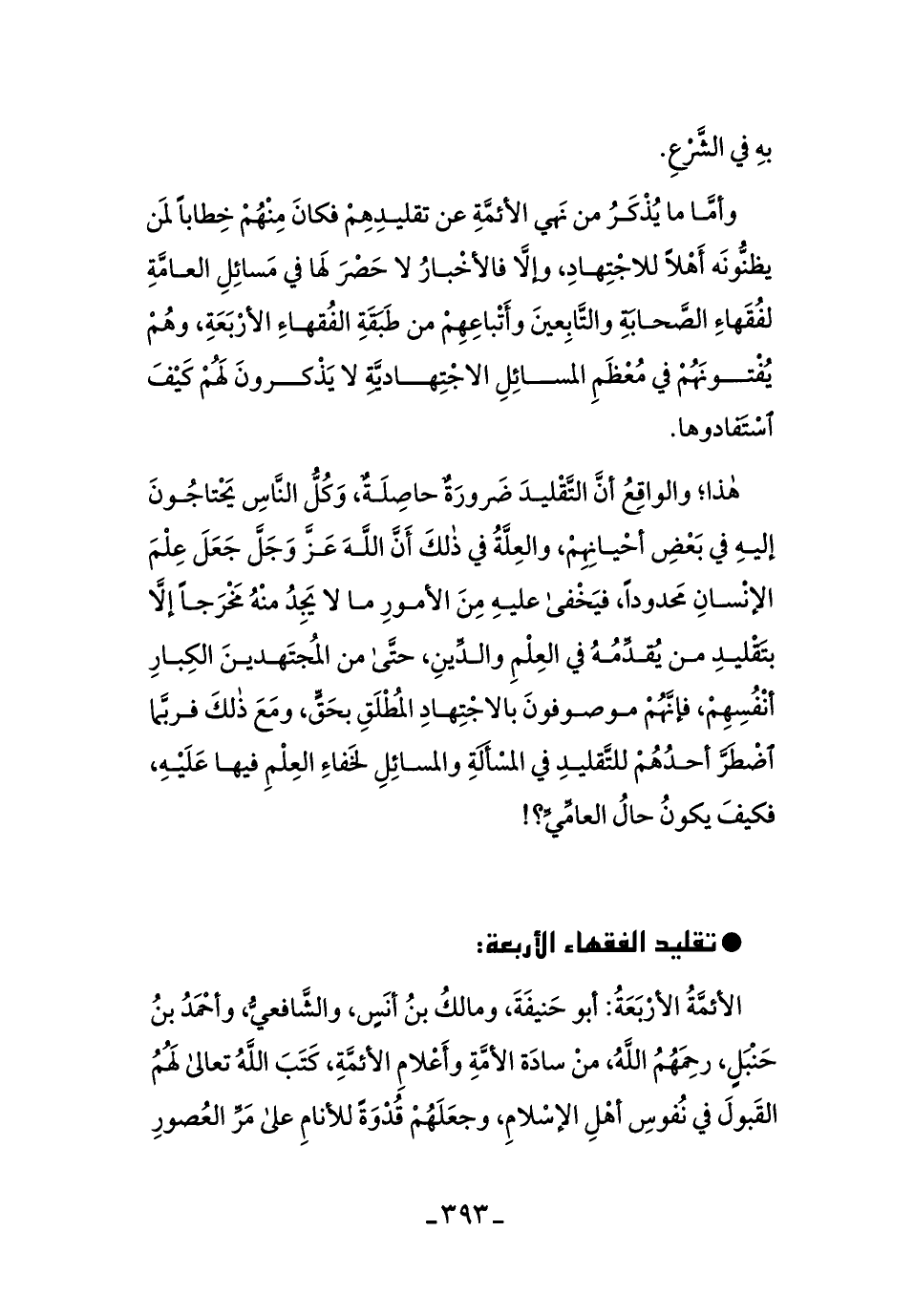 وأمَّا ما يُذكرُ من نهيِ الأئمَّةِ عن تقليدهم فكانَ منهُم خطابًا لمن يظنُّونه أهلاً للاجتهادِ، وإلاَّ فالأخبارُ لا حصرَ لهَا في مسائلِ العامَّةِ لفقهاءِ الصَّحابةِ والتَّابعينَ وأتباعهم من طبقةِ الفقهاءِ الأربعةِ، وهُم يفتونَهُم في معظمِ المسائلِ الاجتهاديَّةِ لا يذكرونَ لهمْ كيفَ استفادُوهَا.