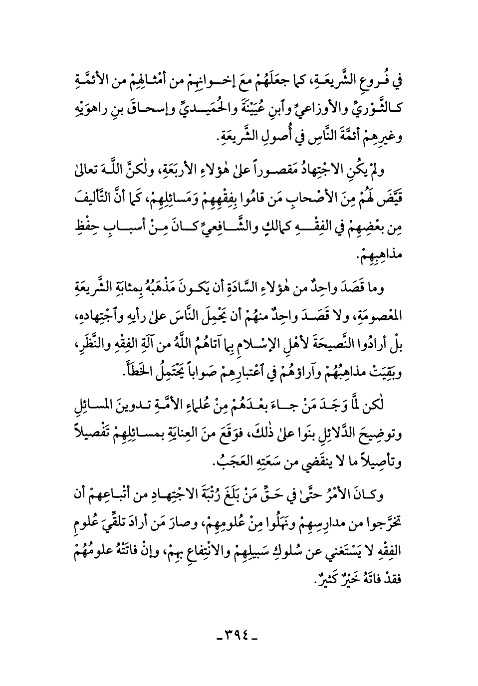 وما قصد واحدٌ من هؤلاءِ السَّادَةِ أن يكونَ مذهُهُ بمثابَةِ الشَّريعَةِ المعصومَةِ، ولا قصدَ واحدٌ منهم أن يحملَ النَّاسَ على رأيهِ واجتهادِهِ، بل أرادُوا النَّصيحة لأهلِ الإسلامِ بما آتاهمُ الله من آلةِ الفقهِ والنَّظرِ، وبقيتْ مذاهبُهم وآراؤهم في اعتبارِهِم صوابًا يحتملُ الخطأ.