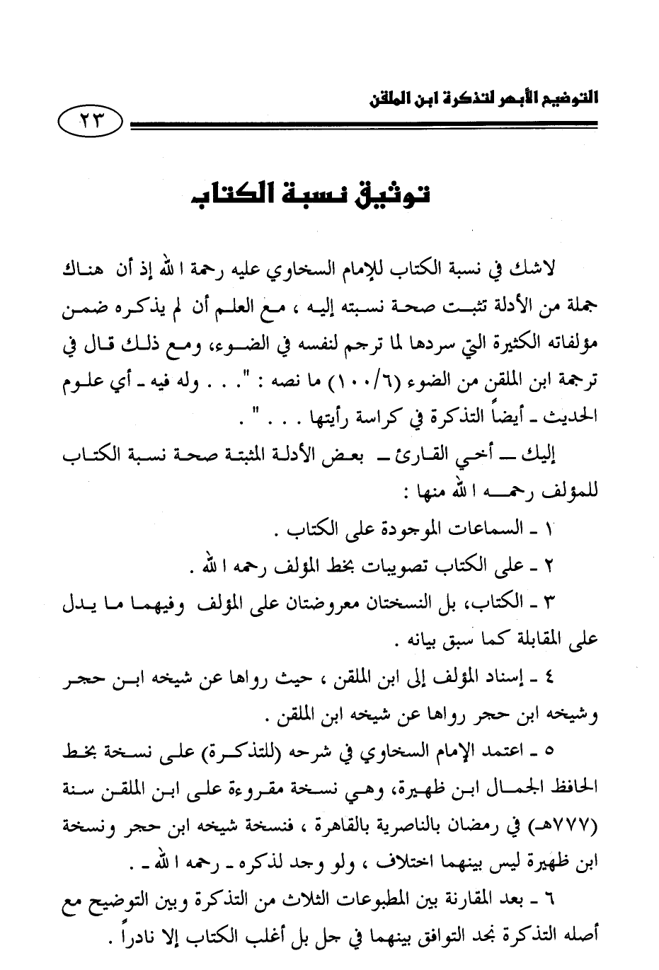 5- اعتمد الإمام السخاوي في شرحه "للتذكرة" على نسخة بخط الحافظ الجمال ابن ظهيرة، وهي نسخة مقروءة على ابن الملقن سنة "777هـ" في رمضان بالناصرية بالقاهرة، فنسخة شيخه ابن حجر ونسخة ابن ظهيرة ليس بينهما اختلاف، ولو وجد لذكره -رحمه الله-.