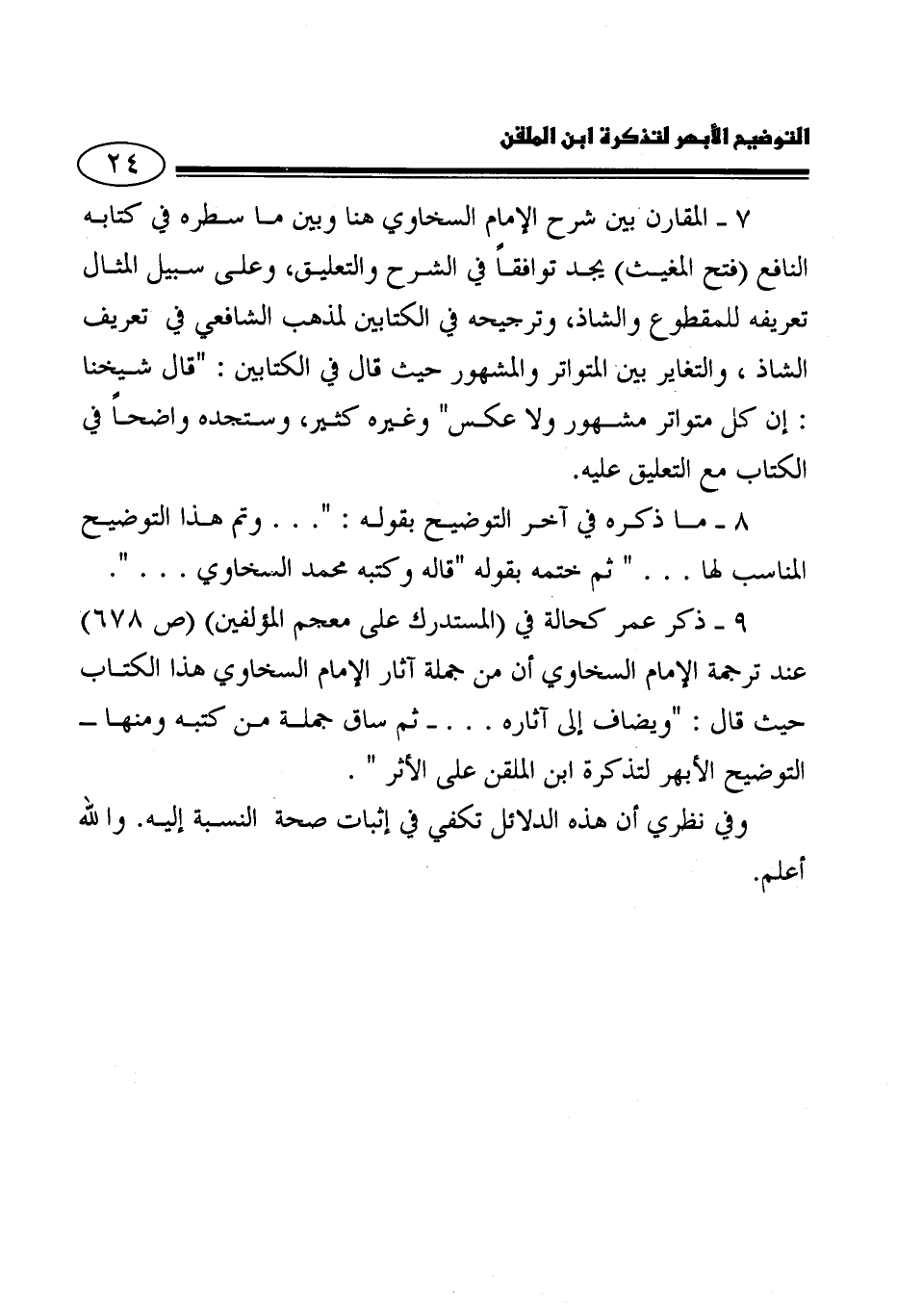 9- ذكر عمر كحالة في "المستدرك على معجم المؤلفين" "ص678" عند ترجمة الإمام السخاوي أن من جملة آثار الإمام السخاوي هذا الكتاب حيث قال: "ويضاف إلى آثاره ... -ثم ساق جملة من كتبه ومنها- التوضيح الأبهر لتذكرة ابن الملقن على الأثر".