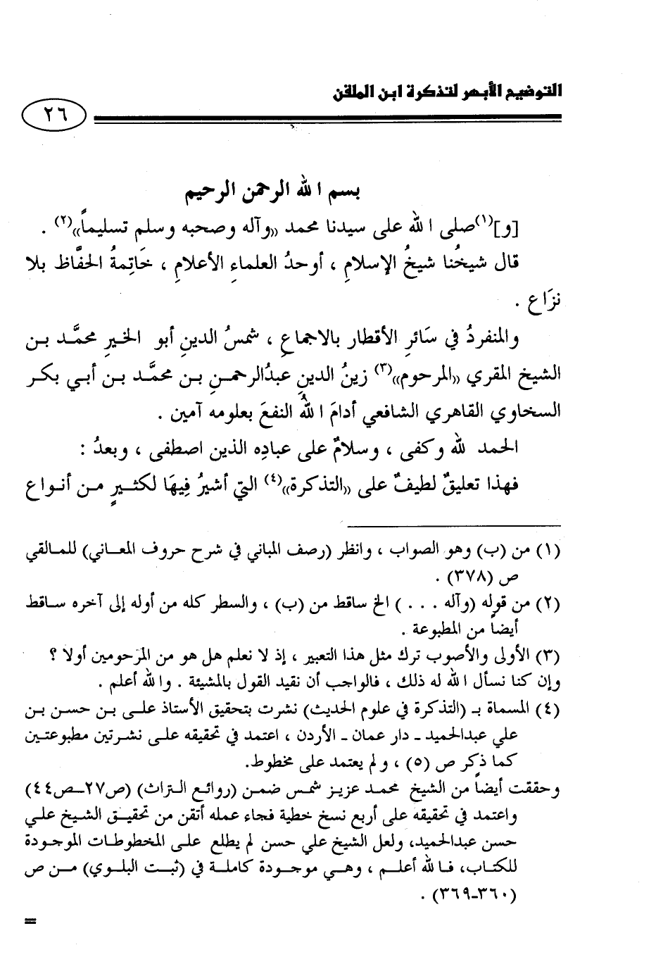 قال شيخنا شيخ الإسلام -أوحدُ العلماء الأعلام، خاتمة الحفاظ بلا نزاع، والمنفرد في سائر الأقطار بالإجماع، شمس الدين أبو الخير محمد بن الشيخ المقري "المرحوم"3 زين الدين عبد الرحمن بن محمد بن أبي بكر السخاوي القاهري الشافعي أدام الله النفع بعلومه آمين.