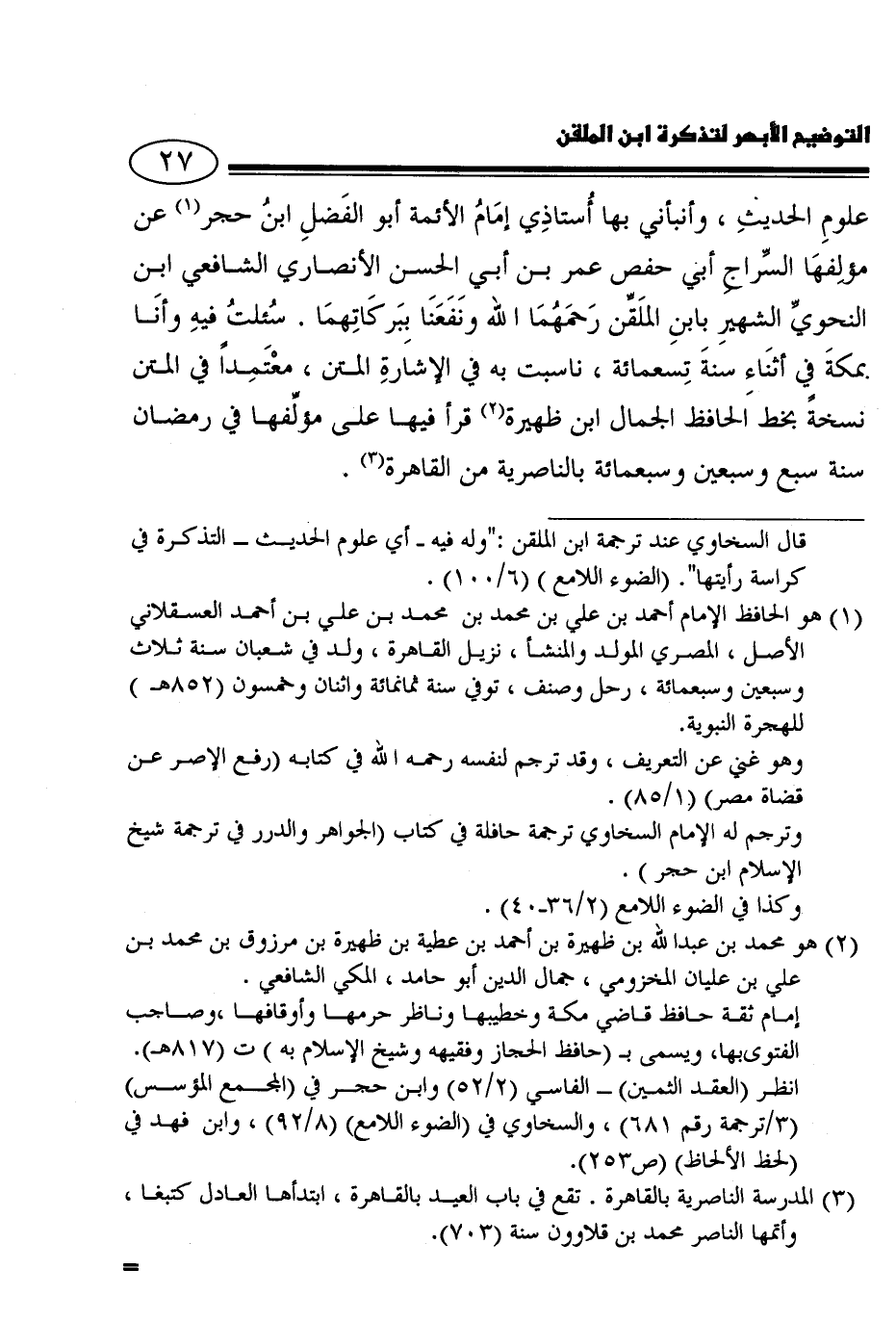 علوم الحديث، وأنبأني بها أستاذي إمام الأئمة أبو الفضل ابن حجر1 عن مؤلفها السراج أبي حفص عمر بن أبي الحسن الأنصاري الشافعي ابن النحوي الشهير بابن الملقن -رحمهما الله ونفعنا ببركاتهما-. سئلت فيه وأنا بمكة في أثناء سنة تسعمائة، ناسبت به في الإشارة المتن، معتمدا في المتن نسخة بخط الحافظ الجمال ابن ظهيرة2 قرأ فيا على مؤلفها في رمضان سنة سبع وسبعين وسبعائة بالناصرية من القاهرة3.