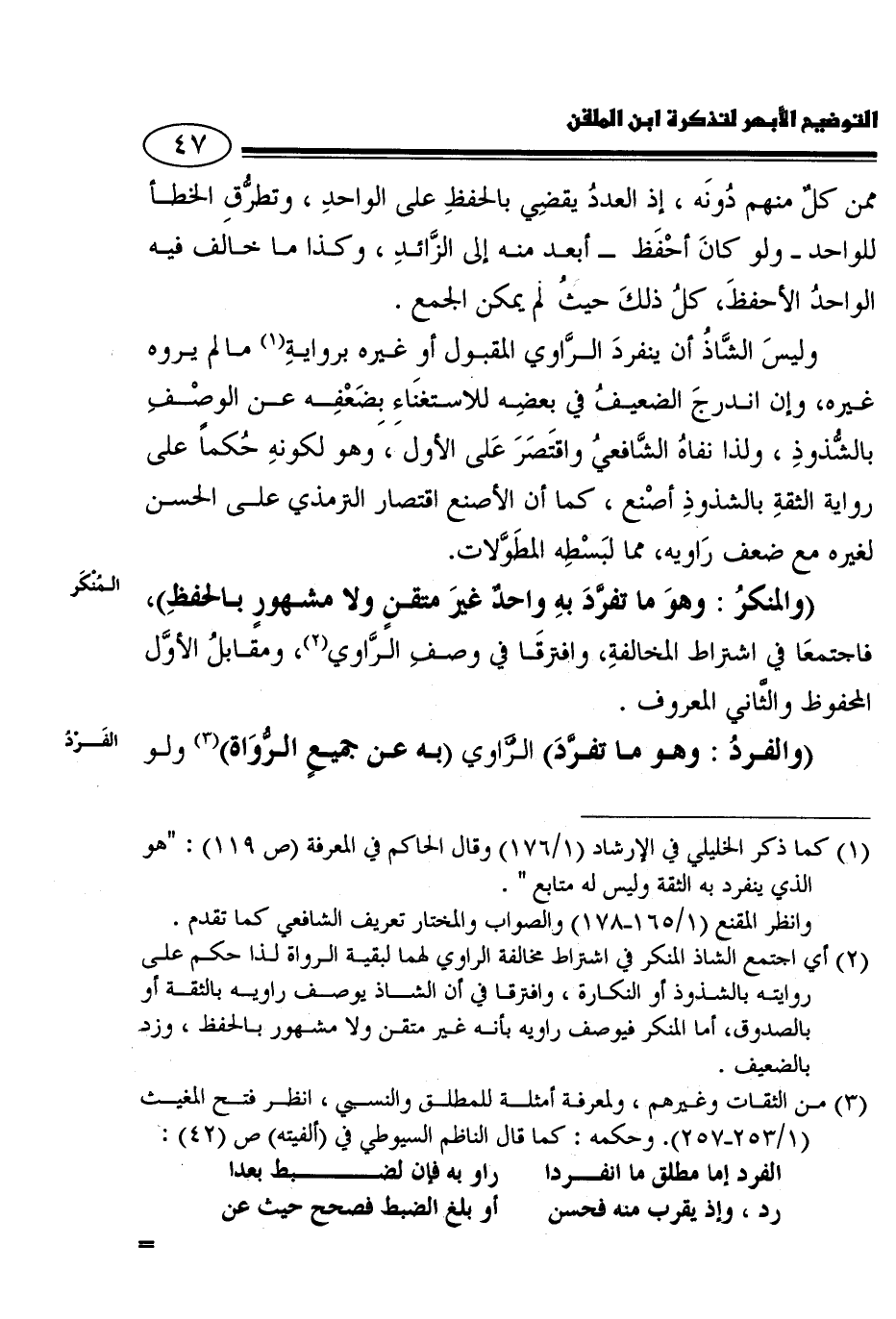 2 أي اجتمع الشاذ المنكر في اشتراط مخالفة الراوي لهما لبقية الرواة لذا حكم على روايته بالشذوذ أو النكارة، وافترقا في أن الشاذ يوصف راويه بالثقة أو بالصدوق، أما المنكر فبوصف راويه بأنه غير متقن ولا مشهور بالحفظ، وزاد بالضعيف.