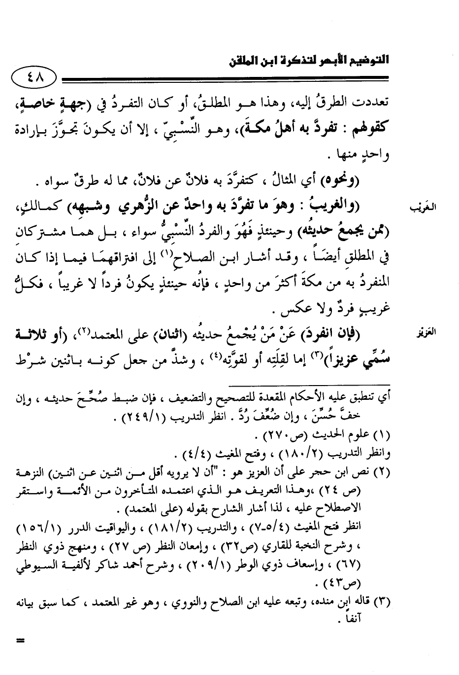 2 نص ابن حجر على أن العزيز هو: "أن لا يرويه أقل من اثنين عن اثنين" النزهة "ص 24"، وهذا التعريف هو الذي اعتمده المتأخرون من الأئمة واستقر الاصطلاح عليه، لذا أشار الشارح بقوله "على المعتمد".
