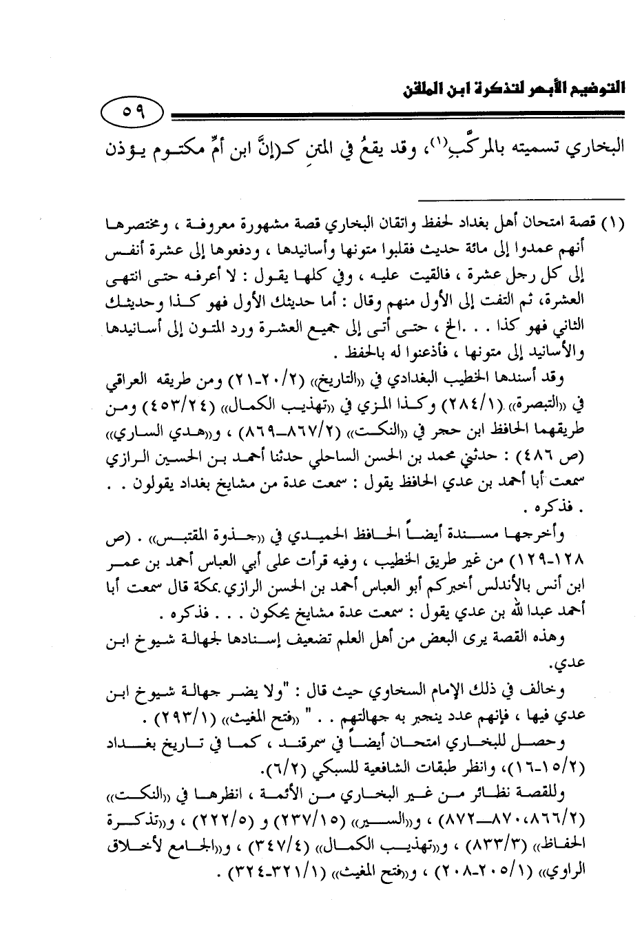 وقد أسندها الخطيب البغدادي في "التاريخ" "2/ 20-21" ومن طريقه العراقي في "التبصرة" "1/ 284" وكذا المزي في "تهذيب الكمال" "24/ 453" ومن طريقهما الحافظ ابن حجر في "النكت" "2/ 867-869"، و "هدى الساري" "ص 486": حدثني محمد بن الحسن الساحلي حدثنا أحمد بن الحسين الرازي سمعت أبا أحمد بن عدي الحافظ يقول: "سمعت عدة من مشايخ بغداد يقولون: ... "