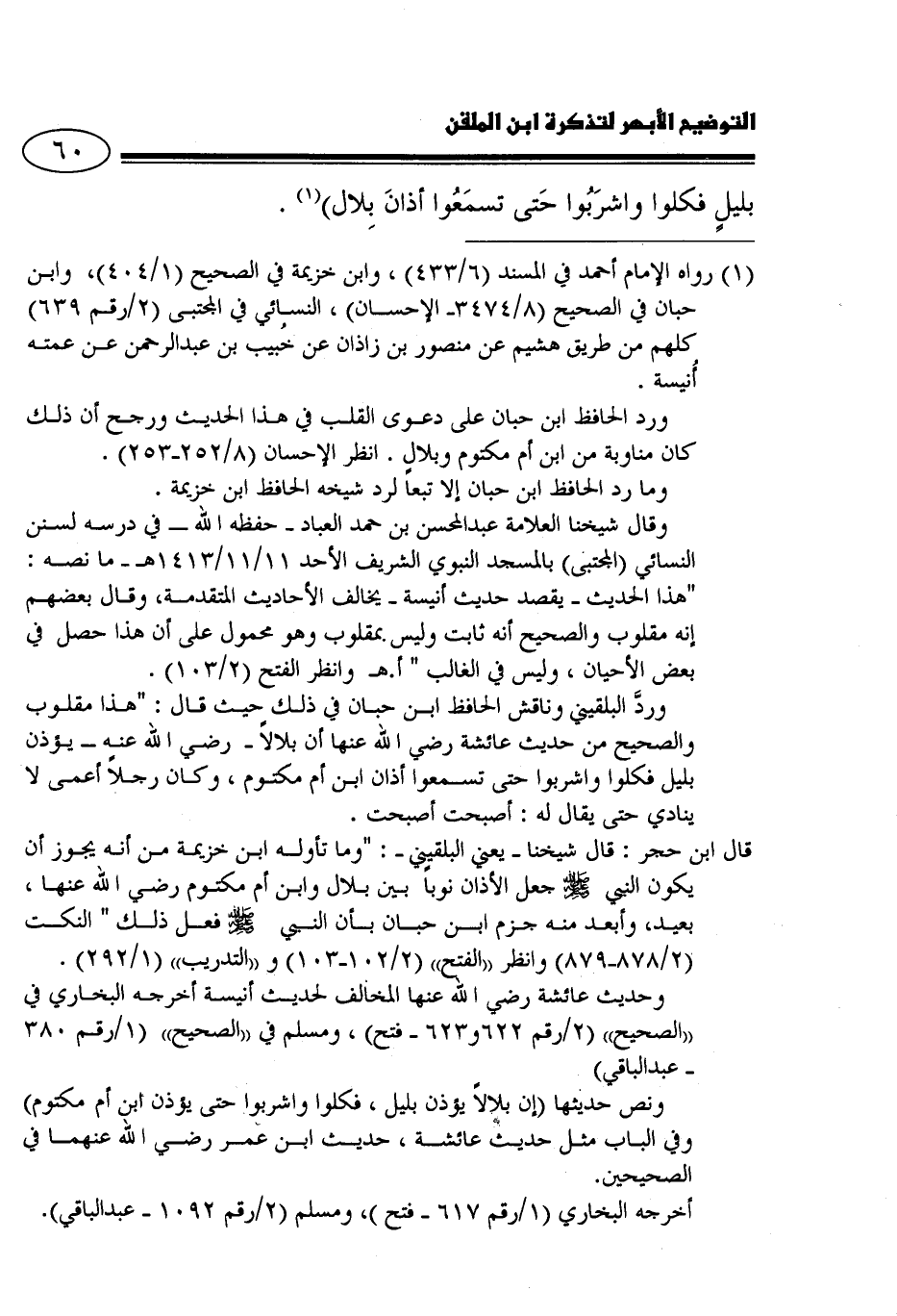 ورد البلقيني وناقش الحافظ ابن حبان في ذلك حيث قال: "هذا مقلوب والصحيح من حديث عائشة -رضي الله عنها- أن بلالًا -رضي الله عنه- يؤذن بليل فكلوا واشربوا حتى تسمعوا أذان ابن أم مكتوم، وكان رجلًا أعمى لا ينادي حتى يقال له: أصبحت أصبحت.