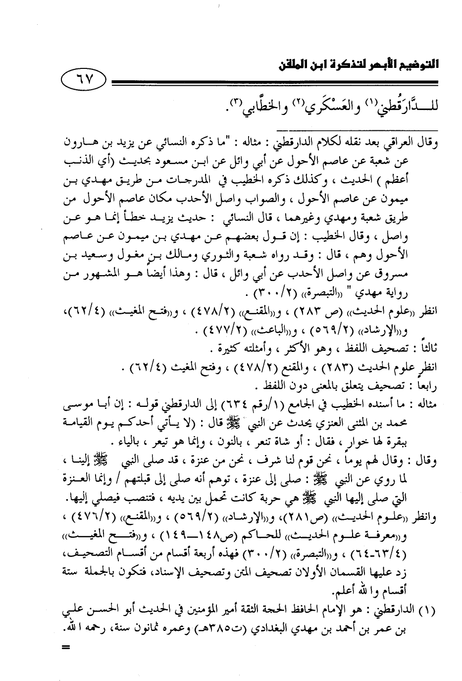 وقال: وقال لهم يومًا، نحن قوم لنا شرف، نحن من عنزة، قد صلى النبي -صلى الله عليه وسلم- إلينا، لما روى عن النبي -صلى الله عليه وسلم-: صلى إلى عنزة، توهم أنه صلى إلى قبلتهم، وإنما العنزة التي صلى إليها النبي -صلى الله عليه وسلم- هي حربة كانت تحمل بين يديه، فتنصب فيصلي إليها. وانظر "علوم الحديث" "ص 281"، و "الإرشاد" "2/ 569"، و "المقنع" "2/ 476"، و "معرفة علوم الحديث" للحاكم "ص 148- 149"، و "فتح المغيث" "4/ 63- 64"، و "التبصرة" "2/ 300" فهذه أربعة أقسام من أقسام التصحيف، زد عليها القسمين الأولين تصحيف المتن وتصحيف الإسناد، فتكون بالجملة ستة أقسام والله أعلم.