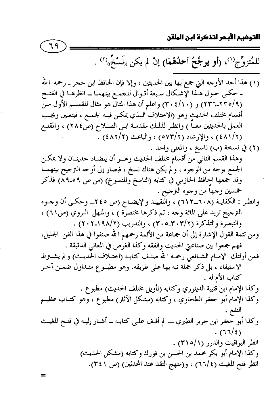 وهذا القسم الثاني من أقسام مختلف الحديث وهو أن يتضاد حديثان ولا يمكن الجمع بوجه من الوجوه، ولم يكن هناك نسخ، فيصار إلى أوجه الترجيح بينهما وقد جمعها الحافظ الحازمي في كتابه "الناسخ والمنسوخ" "من ص 59- 89" فذكر خمسين وجهًا من وجوه الترجيح.