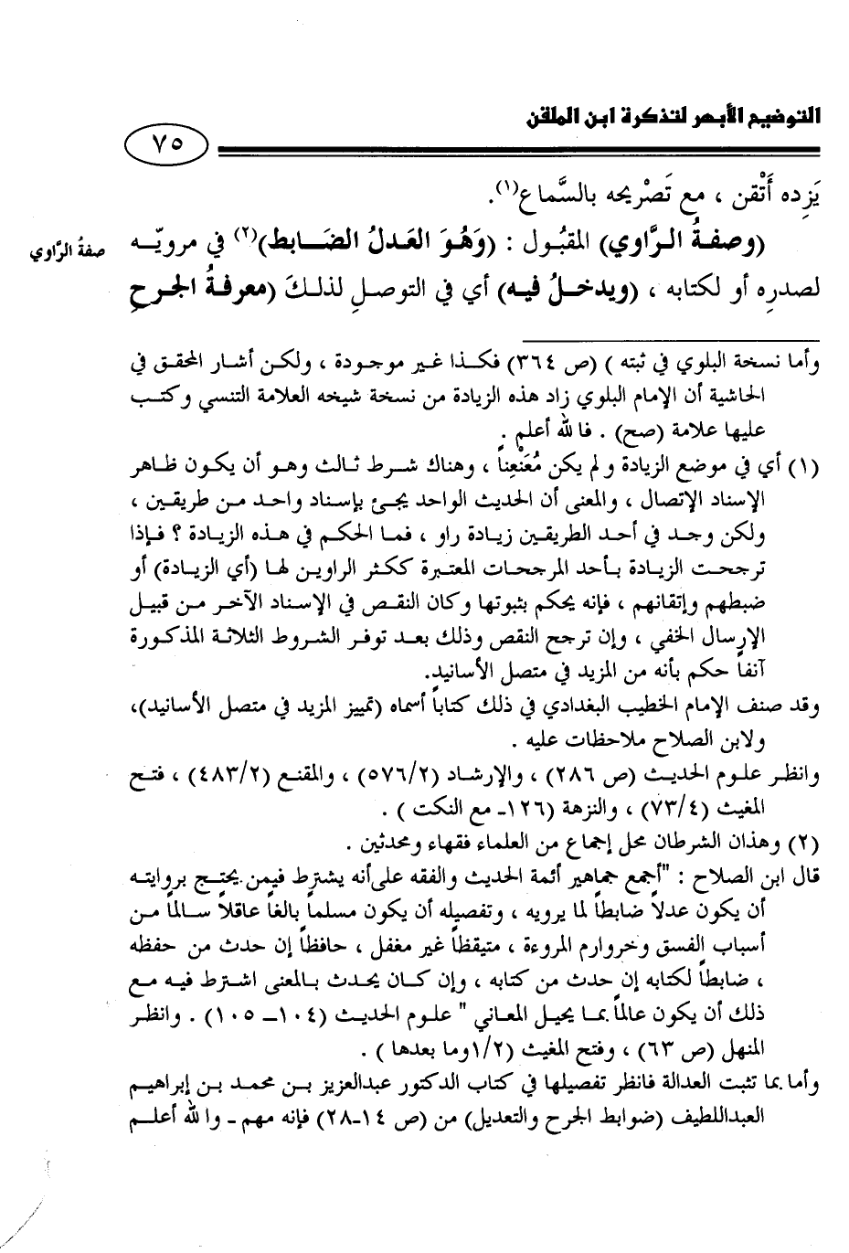 قال ابن الصلاح: "أجمع جماهير أئمة الحديث والفقه على أنه يشترط فيمن يحتج بروايته أن يكون عدلًا ضابطًا لما يرويه، وتفصيله أن يكون مسلمًا بالغًا عاقلًا سالمًا من أسباب الفسق وخوارم المروءة، متيقظًا غير مغفل، حافظًا إن حدث من حفظه، ضابطًا لكتابه إن حدث من كتابه، وإن كان يحدث بالمعنى اشترط فيه مع ذلك أن يكون عالمًا بما يحيل المعاني "علوم الحديث "104- 105". وانظر المنهل "ص 63"، وفتح المغيث "2/ 1 وما بعدها".
