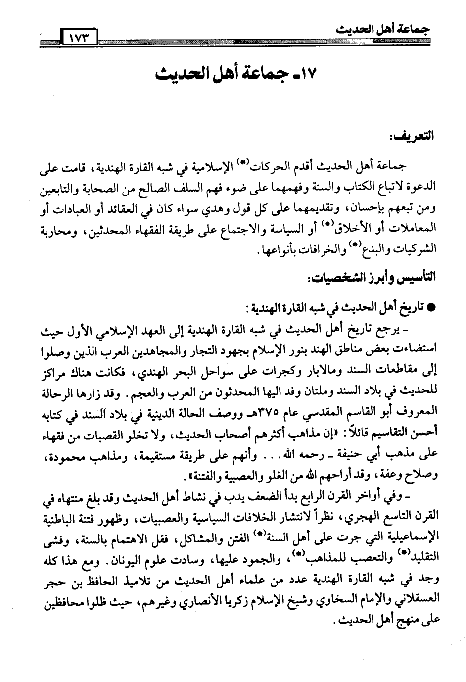ـ العلامة محمد إسماعيل السلفي المولود عام (1314هـ) في قرية دهونكي ونشأ في ظل أسرة متدينة، وطلب العلم في مراحل مبكرة على يد أبيه، ورحل في طلبه على يد أفاضل علماء عصره. وكان ـ رحمه الله ـ من الرواد الأوائل الذين ساهموا في تأسيس جمعية أهل الحديث بباكستان، وكانت لجهوده الدعوية والسياسية أثرها البالغ على البلاد، فتولى الخطابة في جامع أهل الحديث بكجرانوالة، وترأس هيئة التدريس في الجامعة المحمدية التي أنشأها، كما عين مشرفاً على مقر جمعية تنظيم أهل الحديث بالبنجاب ثم انتخب أميناً عاماً للجنة العلم لجمعية أهل الحديث في مؤتمر دهلي 1946م، وبعد انفصال باكستان عن الهند عام 1947م انتخب أميناً عامًّا لجمعية أهل الحديث بباكستان حتى وفاته 1968م، وكان الشيخ محمد إسماعيل السلفي أحد أعضاء المجلس التنفيذي لحركة (*) ختم النبوة التي أنشئت لمقاومة الفتنة القاديانية، وعضواً بارزاً في الوفد التبليغي الذي قاوم حركة شدهي الهندوسية التي بدأت تهنّد المسلمين سنة 1924م في منطقة مل كانون بالإضافة إلى دوره الدعوي في التدريس والإفتاء وأمور الدعوة والإرشاد. وللشيخ مساهمات جيدة في إقامة المستوطنات ومساعدة الأسر المهجرة من الهند إلى باكستان سنة 1947م، بالإضافة إلى بناء المساجد والمدارس الدينية، مع هذا كله فقد كان للشيخ محمد إسماعيل نشاط سياسي بارز متأثراً في ذلك بالشيخ أبو الكلام آزاد، ومن ذلك تمثيله والشيخ محمد داود الغزنوي لجمعية أهل الحديث لدى الحكومة الباكستانية للمطالبة بإقامة الحكم الإسلامي في باكستان. وفي سنة 1952م اختير عضواً في اللجنة التي شكلت لتدوين الدستور الإسلامي بباكستان. توفي ـ رحمه الله ـ يوم الثلاثاء العشرين من شهر ذي القعدة 1387هـ الموافق العشرين من فبراير 1968هـ تاركاً العديد من المؤلفات أبرزها: شرح وترجمة مشكاة المصابيح باللغة الأردية.