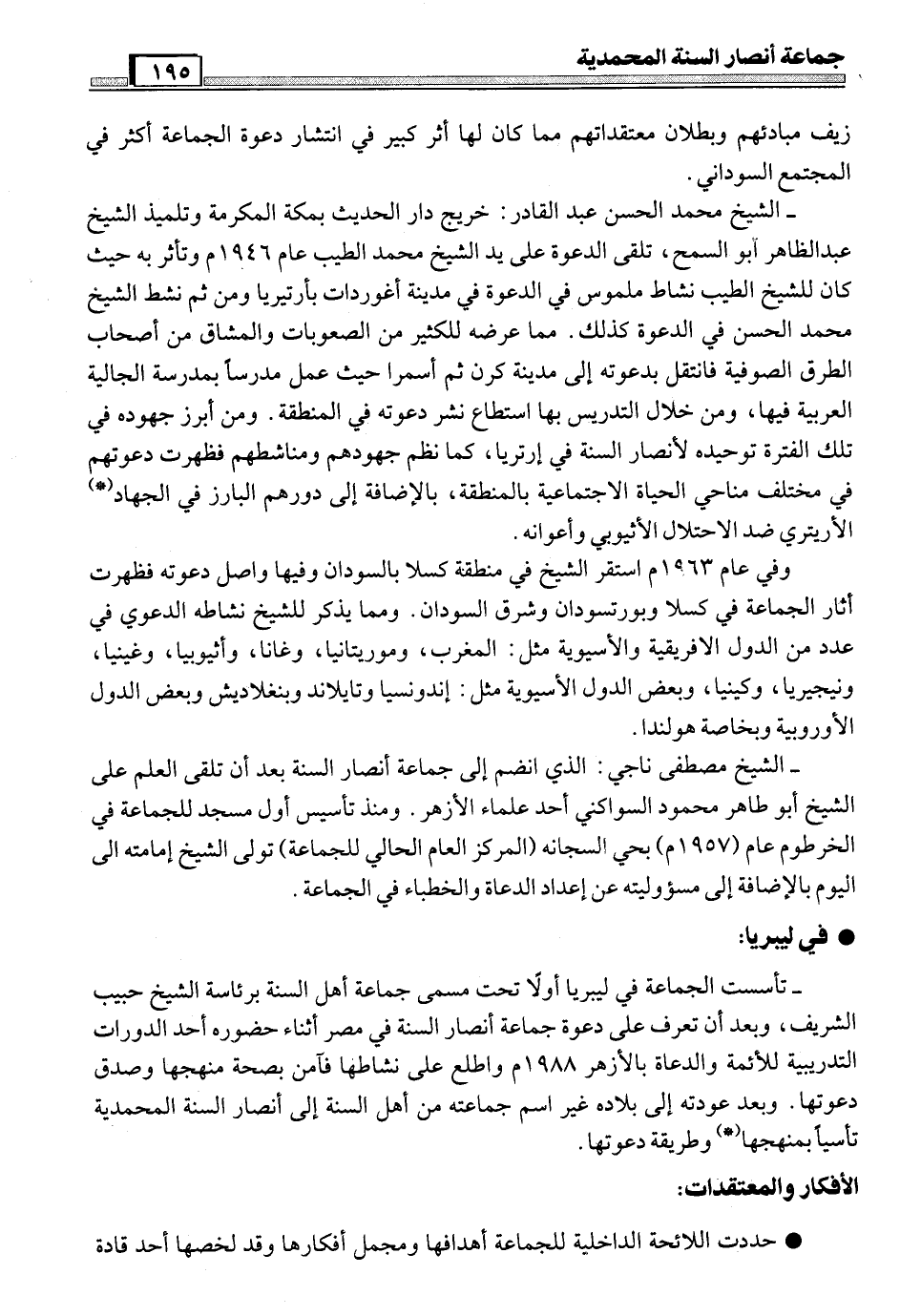 · إن جماعة أنصار السنة المحمدية أحد الأعمال الجماعية المنظمة التي تقوم على العقيدة السلفية للتصدي لغلاة المتصوفة ومحاربة البدع (*) بكافة أشكالها، وبيان التوحيد والحض على إتباع السنة، مما كان لها الأثر الإيجابي في انحسار تيار التصوف في مصر في بيئات محدودة، وكذلك في السودان كان لها تأثير بالغ في قطاع واسع من الشباب رغم تجذر الطوائف والطرق الصوفية هناك.