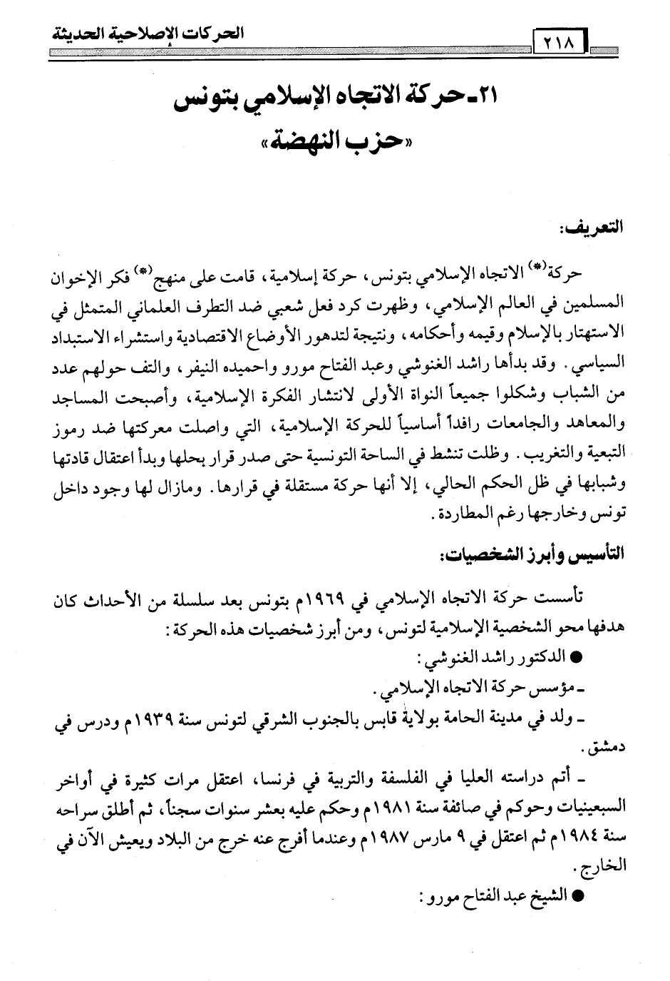 أن حركة الاتجاه الإسلامي بتونس هي حركة إسلامية تتبنى كثيراً من المفاهيم الفكرية لحركة الإخوان المسلمين، وهدفها القضاء على المد العلماني، وبعث الشخصية الإسلامية وتجديد (*) الفكر الإسلامي، وإعادة بناء الحياة الاقتصادية على أسس إنسانية، وبعث الكيان السياسي والحضاري للإسلام