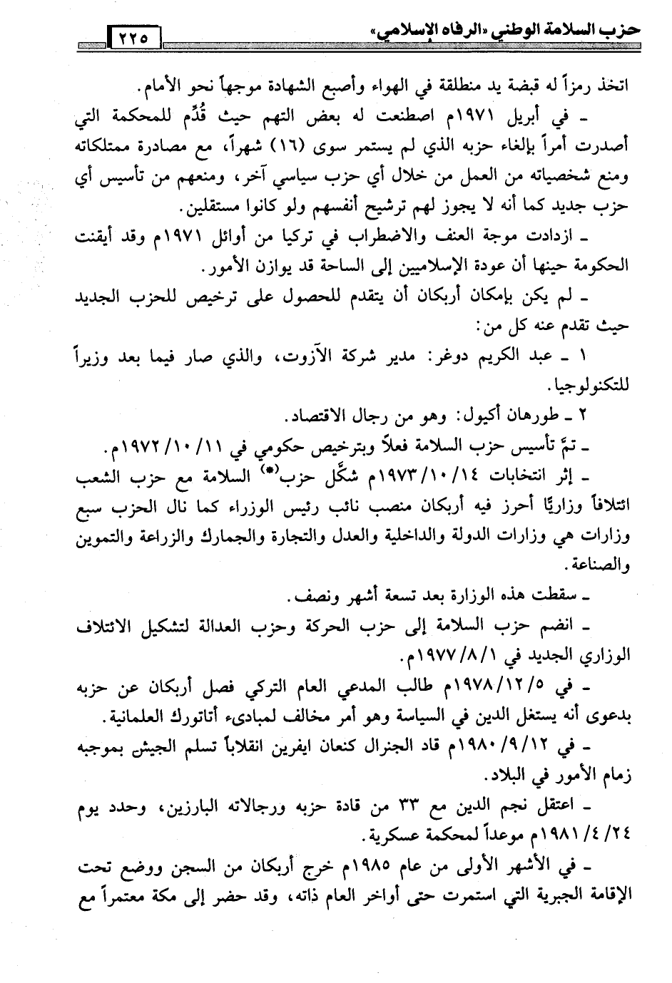 أن حزب السلامة الوطني أو ما يعرف الآن بحزب الرفاه، رغم أنه لا يحمل لافتة أو تسمية إسلامية، بسبب أنظمة تركيا العلمانية، التي لا تسمح بالترخيص لأي حزب أو جماعة دينية، إلا أنه يتبنى أيديولوجية (*) إسلامية تقوم على الإيمان بالله والاهتمام بالأخلاق والاعتزاز بحضارة الإسلام والعودة بتركيا إلى تراثها الإسلامي. (مع التنبه إلى المؤاخذات التي سبقت الإشارة لها) .