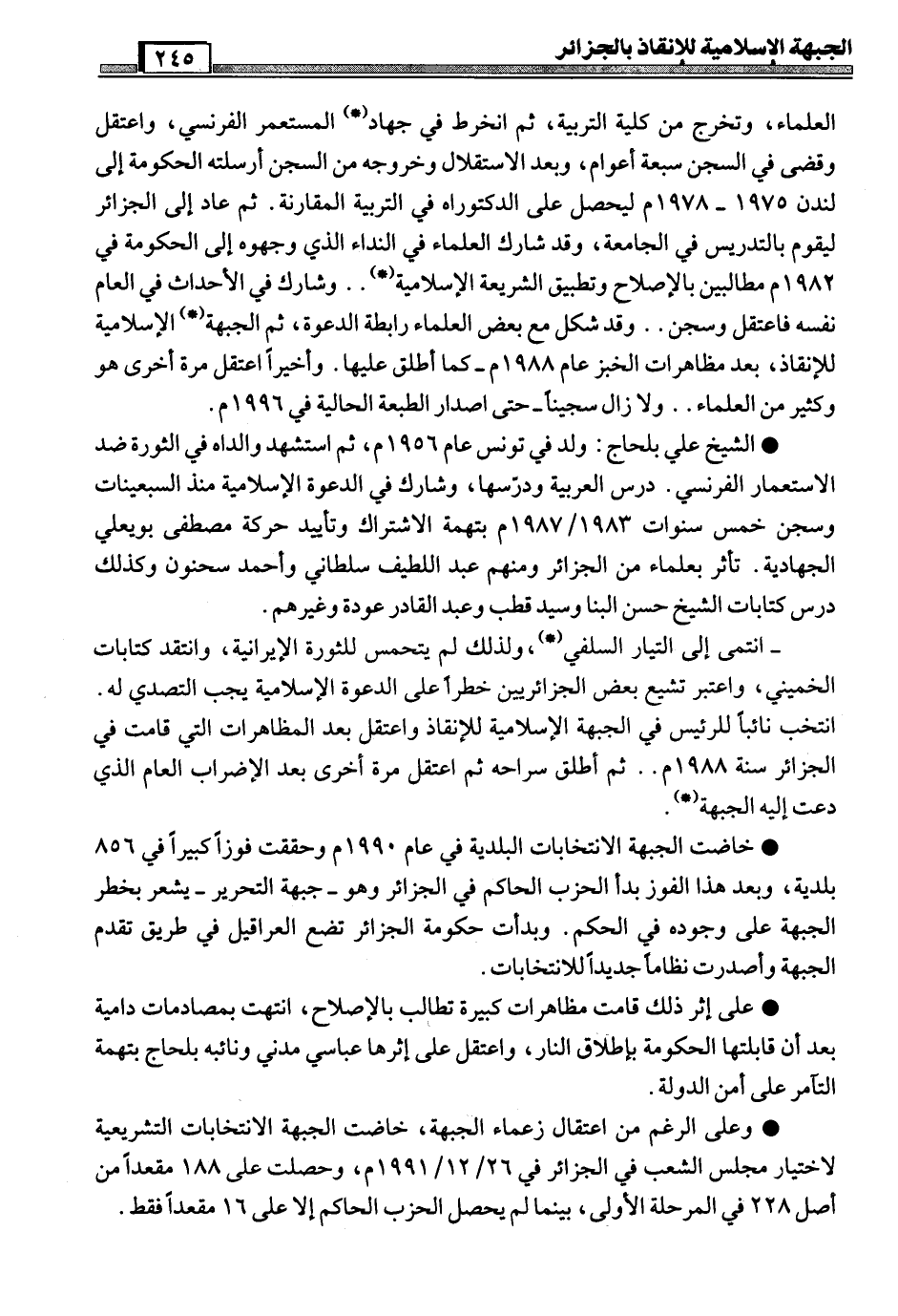 الساحق للجبهة، وتولى الحكم الرئيس محمد بوضياف الذي اغتيل ولا زالت الأحداث تتوالى سراعاً؛ حتى تولى الحكم أخيرًا عبد العزيز بوتفليقة الذي هدأت الأمور في عهده.