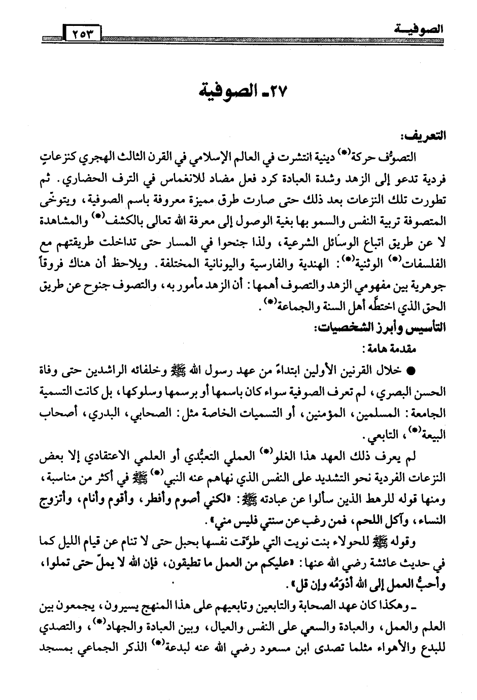 ـ ومن أهم السمات الأخرى لهذه الطبقة: بداية التمييز عن جمهور المسلمين والعلماء، وظهور مصطلحات (*) تدل على ذلك بشكل مهَّد لظهور الطرق من بعد، مثل قول بعضهم: علمُنا، مذهبنا (*) ، طريقنا، قال الجنيد: (علمنا مشتبك مع حديث رسول (*) الله صلى الله عليه وسلم) وهو انتساب محرم شرعاً حيث يفضي إلى البدعة (*) والمعصية بل وإلى الشرك أيضاً، وقد اشترطوا على من يريد السير معهم في طريقتهم أن يَخرُجَ من ماله، وأن يُقلَّ من غذائه وأن يترك الزواج مادام في سلوكه.
