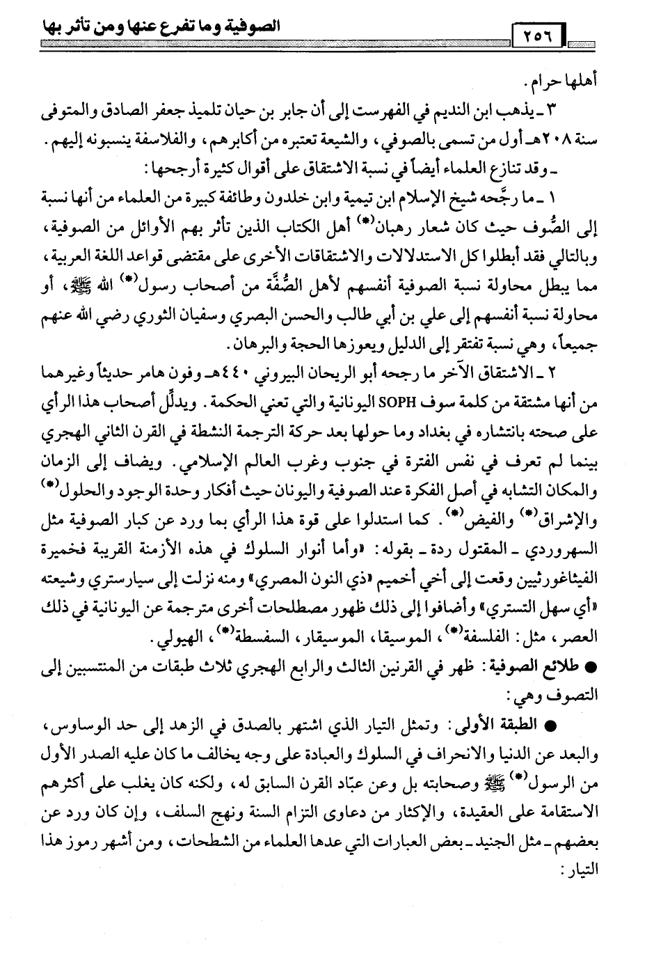 وفيها اختلط التصوف بالفلسفة (*) اليونانية، وظهرت أفكار الحلول (*) والاتحاد (*) ووحدة الوجود، على أن الموجود الحق هو الله وما عداه فإنها صور زائفة وأوهام وخيالات موافقة لقول الفلاسفة، كما أثرت في ظهور نظريات الفيض (*) والإشراق (*) على يد الغزالي والسهروردي. وبذلك تعد هذه الطبقة من أخطر الطبقات والمراحل التي مر بها التصوف والتي تعدت به مرحلة البدع العملية إلى البدع العلمية التي بها يخرج التصوف عن الإسلام بالكلية. ومن أشهر رموز هذه الطبقة: الحلاج ت309هـ، السهروردي 587هـ، ابن عربي ت638هـ، ابن الفارض 632هـ، ابن سبعين ت 667 هـ.