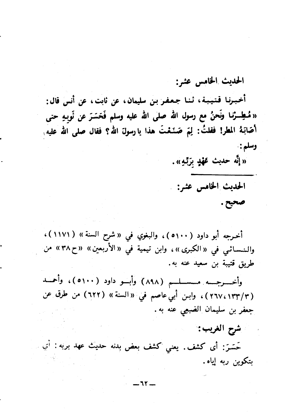 15 - أَخْبَرَنَا قُتَيْبَةُ، ثنا جَعْفَرُ بْنُ سُلَيْمَانَ، عَنْ ثَابِتٍ، عَنْ أَنَسٍ قَالَ: مُطِرْنَا وَنَحْنُ مَعَ رَسُولِ اللَّهِ صَلَّى اللَّهُ عَلَيْهِ وَسَلَّمَ، §فَحَسَرَ عَنْ ثَوْبِهِ حَتَّى أَصَابَهُ الْمَطَرُ , فَقُلْتُ: لِمَ صَنَعْتَ هَذَا يَا رَسُولَ اللَّهِ؟ فَقَالَ صَلَّى اللَّهُ عَلَيْهِ وَسَلَّمَ: «إِنَّهُ حَدِيثُ عَهْدٍ بِرَبِّهِ»