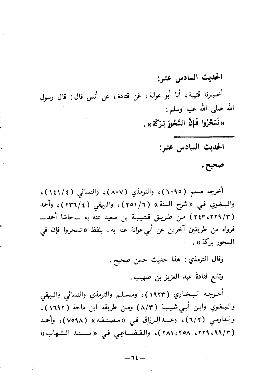 16 - أَخْبَرَنَا قُتَيْبَةُ، أنا أَبُو عَوَانَةَ، عَنْ قَتَادَةَ، عَنْ أَنَسٍ قَالَ: قَالَ رَسُولُ اللَّهِ صَلَّى اللَّهُ عَلَيْهِ وَسَلَّمَ: «§تَسَحَّرُوا فَإِنَّ فِي السَّحُورِ بَرَكَةً»