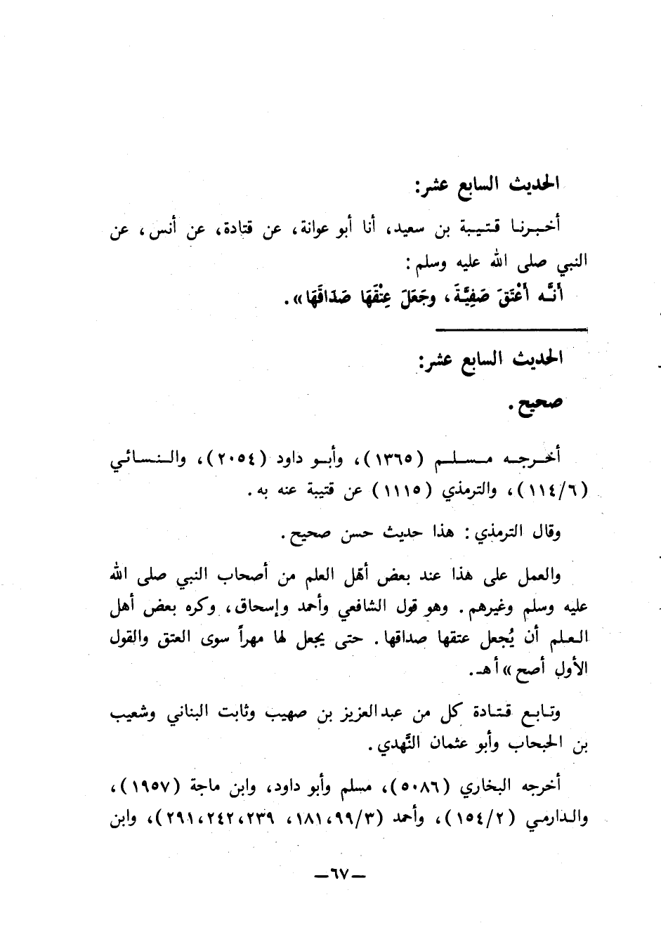 17 - أَخْبَرَنَا قُتَيْبَةُ بْنُ سَعِيدٍ، أنا أَبُو عَوَانَةَ، عَنْ قَتَادَةَ، عَنْ أَنَسٍ، عَنِ النَّبِيِّ صَلَّى اللَّهُ عَلَيْهِ وَسَلَّمَ: «أَنَّهُ §أَعْتَقَ صَفِيَّةَ، وَجَعَلَ عِتْقَهَا صَدَاقَهَا»