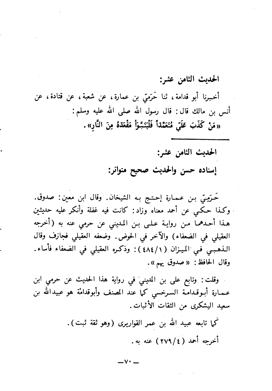 18 - أَخْبَرَنَا أَبُو قُدَامَةَ، ثنا حَرَمِيُّ بْنُ عُمَارَةَ، عَنْ شُعْبَةَ، عَنْ قَتَادَةَ، عَنْ أَنَسِ بْنِ مَالِكٍ قَالَ: قَالَ رَسُولُ اللَّهِ صَلَّى اللَّهُ عَلَيْهِ وَسَلَّمَ: «§مَنْ كَذَبَ عَلَيَّ مُتَعَمِّدًا فَلْيَتَبَوَّأْ مَقْعَدَهُ مِنَ النَّارِ»