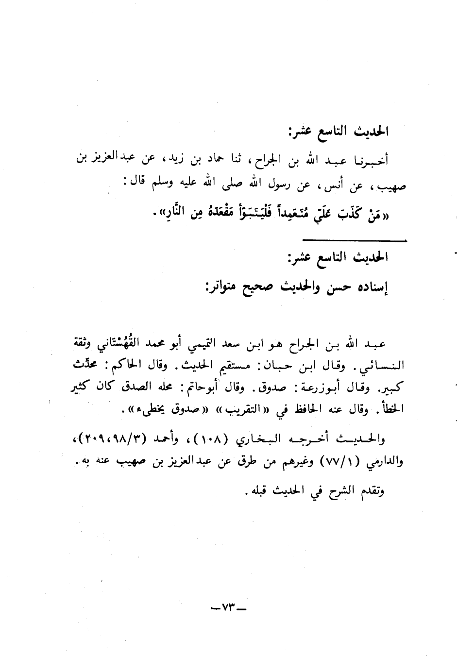 19 - أَخْبَرَنَا عَبْدُ اللَّهِ بْنُ الْجَرَّاحِ، ثنا حَمَّادُ بْنُ زَيْدٍ، عَنْ عَبْدِ الْعَزِيزِ بْنِ صُهَيْبٍ، عَنْ أَنَسٍ، عَنْ رَسُولِ اللَّهِ صَلَّى اللَّهُ عَلَيْهِ وَسَلَّمَ قَالَ: «§مَنْ كَذَبَ عَلَيَّ مُتَعَمِّدًا فَلْيَتَبَوَّأْ مَقْعَدَهُ مِنَ النَّارِ»