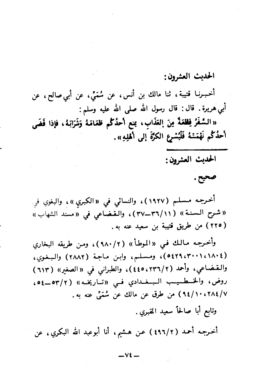20 - أَخْبَرَنَا قُتَيْبَةُ، ثنا مَالِكُ بْنُ أَنَسٍ، عَنْ سُمِّيٍّ، عَنْ أَبِي صَالِحٍ، عَنْ أَبِي هُرَيْرَةَ قَالَ: قَالَ رَسُولُ اللَّهِ صَلَّى اللَّهُ عَلَيْهِ وَسَلَّمَ: «§السَّفَرُ قِطْعَةٌ مِنَ الْعَذَابِ، يَمْنَعُ أَحَدَكُمْ طَعَامَهُ وَشَرَابَهُ، فَإِذَا قَضَى أَحَدُكُمْ نَهْمَتَهُ فَلْيُسْرِعِ الْكَرَّةَ إِلَى أَهْلِهِ»