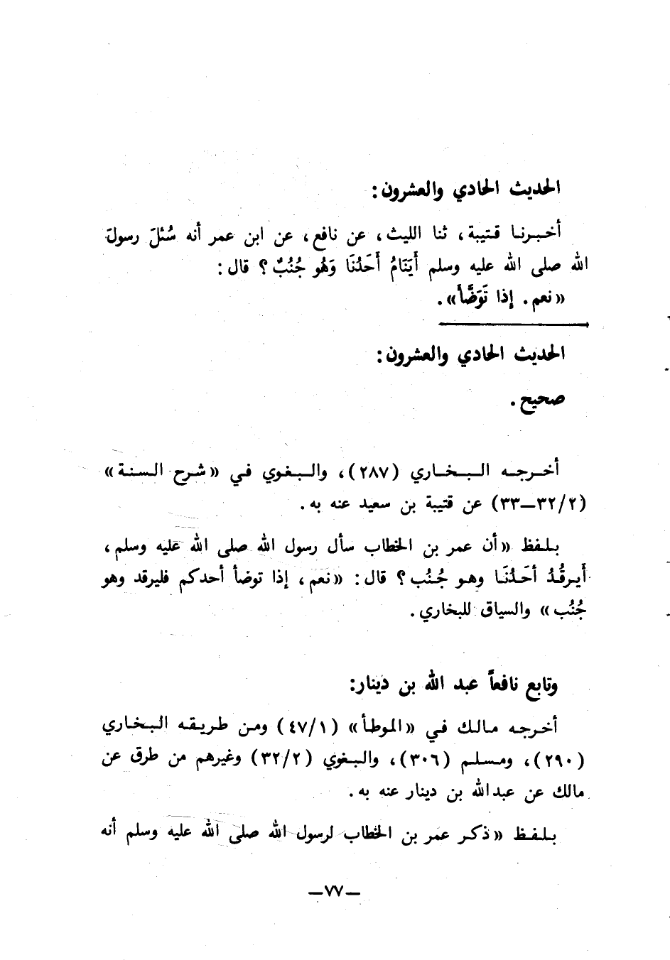 21 - أَخْبَرَنَا قُتَيْبَةُ، ثنا اللَّيْثُ، عَنْ نَافِعٍ، عَنِ ابْنِ عُمَرَ أَنَّهُ سُئِلَ رَسُولُ اللَّهِ صَلَّى اللَّهُ عَلَيْهِ وَسَلَّمَ §أَيَنَامُ أَحَدُنَا وَهُوَ جُنُبٌ؟ قَالَ: «نَعَمْ، إِذَا تَوَضَّأَ»