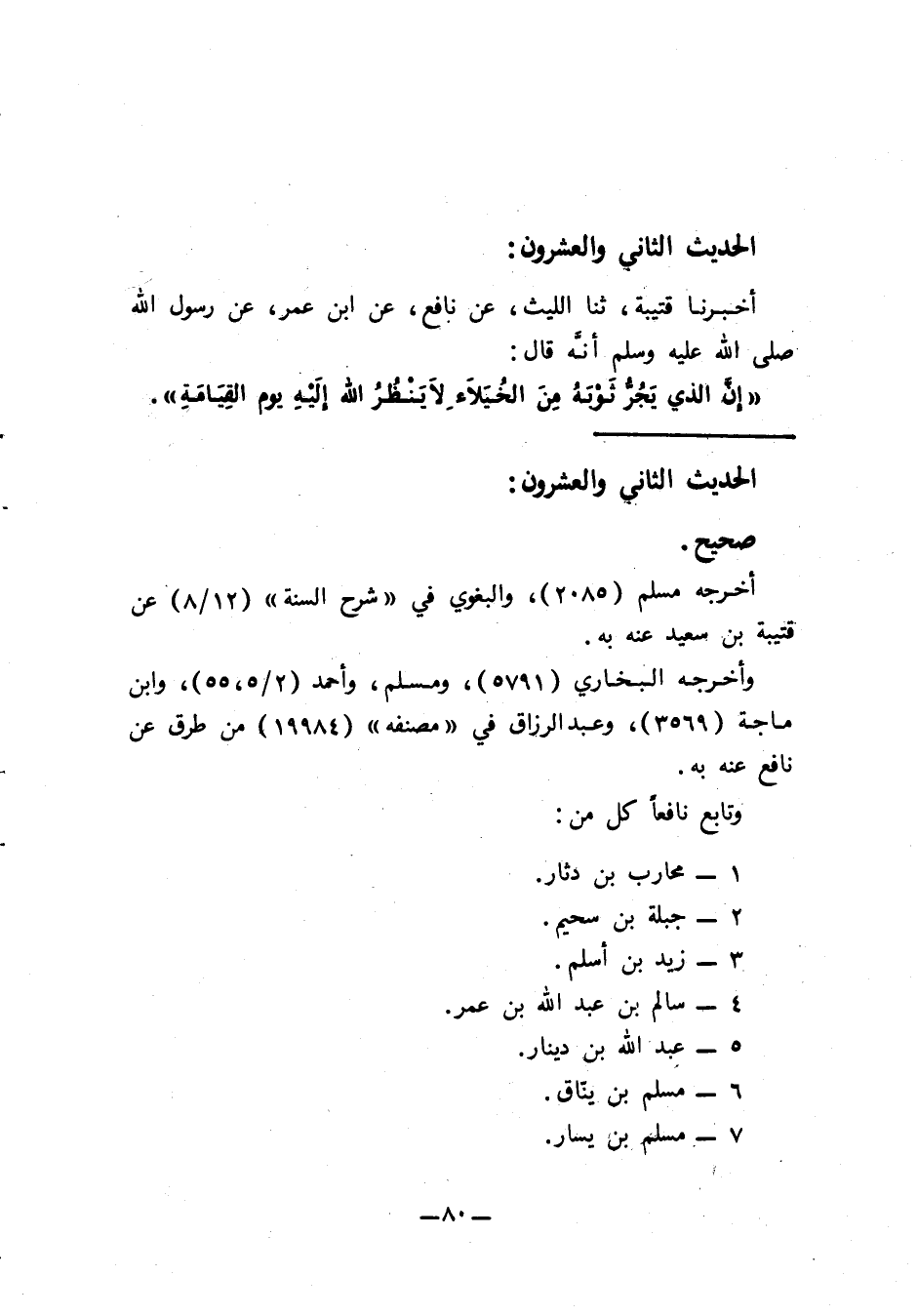 22 - أَخْبَرَنَا قُتَيْبَةُ، ثنا اللَّيْثُ، عَنْ نَافِعٍ، عَنِ ابْنِ عُمَرَ، عَنْ رَسُولِ اللَّهِ صَلَّى اللَّهُ عَلَيْهِ وَسَلَّمَ أَنَّهُ قَالَ: «إِنَّ §الَّذِي يَجُرُّ ثَوْبَهُ مِنَ الْخُيَلَاءِ لَا يَنْظُرُ اللَّهُ إِلَيْهِ يَوْمَ الْقِيَامَةِ»
