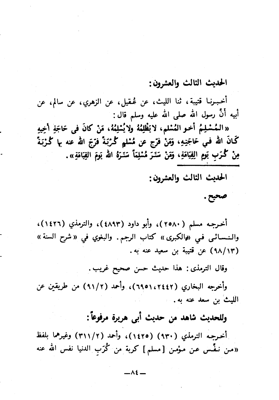 23 - أَخْبَرَنَا قُتَيْبَةُ، ثنا اللَّيْثُ، عَنْ عُقَيْلٍ، عَنِ الزُّهْرِيِّ، عَنْ سَالِمٍ، عَنْ أَبِيهِ أَنَّ رَسُولَ اللَّهِ صَلَّى اللَّهُ عَلَيْهِ وَسَلَّمَ قَالَ: «§الْمُسْلِمُ أَخُو الْمُسْلِمِ، لَا يَظْلِمُهُ وَلَا يُسْلِمُهُ، مَنْ كَانَ فِي حَاجَةِ أَخِيهِ كَانَ اللَّهُ فِي حَاجَتِهِ، وَمَنْ فَرَّجَ عَنْ مُسْلِمٍ كُرْبَةً فَرَّجَ اللَّهُ عَنْهُ بِهَا كُرْبَةً مِنْ كُرَبِ يَوْمِ الْقِيَامَةِ، وَمَنْ سَتَرَ مُسْلِمًا سَتَرَهُ اللَّهُ يَوْمَ الْقِيَامَةِ»