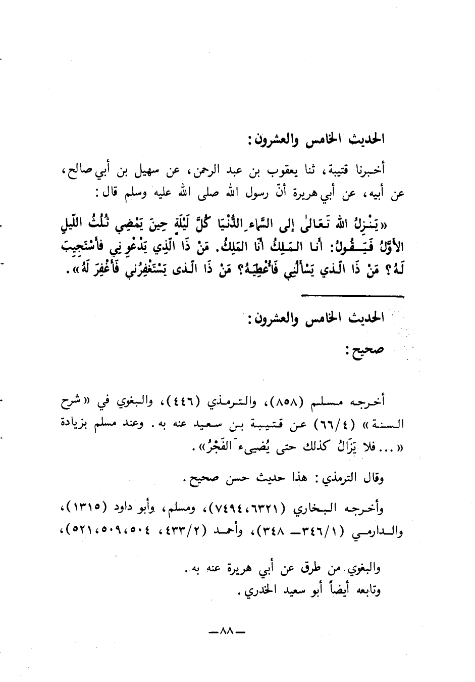 25 - أَخْبَرَنَا قُتَيْبَةُ، ثنا يَعْقُوبُ بْنُ عَبْدِ الرَّحْمَنِ، عَنْ سُهَيْلِ بْنِ أَبِي صَالِحٍ، عَنْ أَبِيهِ، عَنْ أَبِي هُرَيْرَةَ أَنَّ رَسُولَ اللَّهِ صَلَّى اللَّهُ عَلَيْهِ وَسَلَّمَ قَالَ: " يَنْزِلُ اللَّهُ تَعَالَى إِلَى السَّمَاءِ الدُّنْيَا كُلَّ لَيْلَةٍ حِينَ يَمْضِي ثُلُثُ اللَّيْلِ الْأَوَّلُ، فَيَقُولُ: §أَنَا الْمَلِكُ أَنَا الْمَلِكُ. مَنْ ذَا الَّذِي يَدْعُونِي فَأَسْتَجِيبَ لَهُ؟ مَنْ ذَا الَّذِي يَسْأَلُنِي فَأُعْطِيَهُ؟ مَنْ ذَا الَّذِي يَسْتَغْفِرُنِي فَأَغْفِرَ لَهُ؟ "