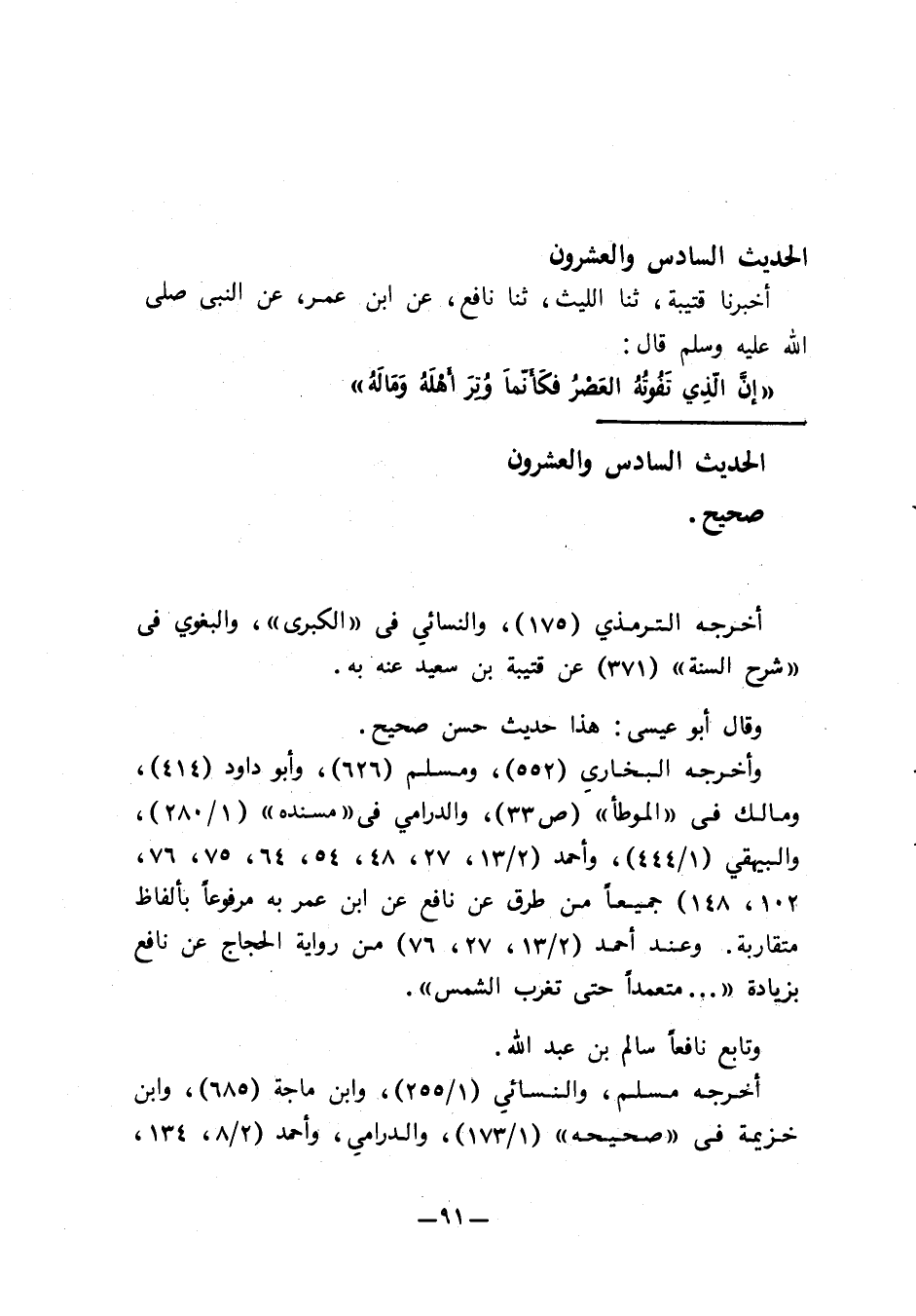 26 - أَخْبَرَنَا قُتَيْبَةُ، ثنا اللَّيْثُ، ثنا نَافِعٌ، عَنِ ابْنِ عُمَرَ، عَنِ النَّبِيِّ صَلَّى اللَّهُ عَلَيْهِ وَسَلَّمَ قَالَ: «إِنَّ §الَّذِي تَفُوتُهُ الْعَصْرُ فَكَأَنَّمَا وُتِرَ أَهْلَهُ وَمَالَهُ»