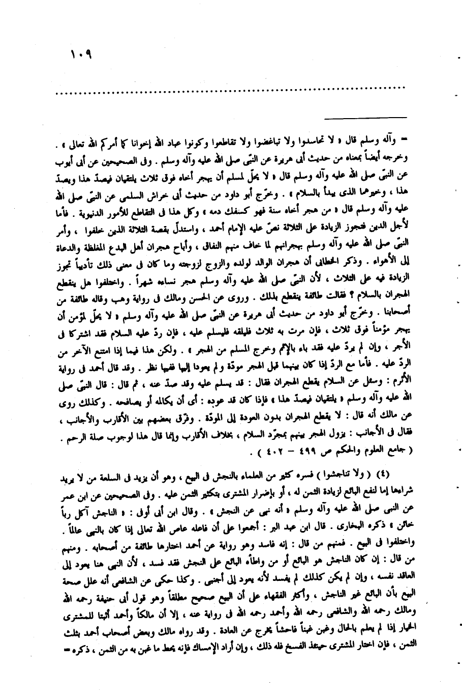 4 "ولا تناجشوا" فسره كثير من العلماء بالنجش في البيع، وهو أن يزيد في السلعة من لا يريد شراءها إما لنفع البائع لزيادة الثمن له، أو بإضرار المشتري بتكثير الثمن عليه.