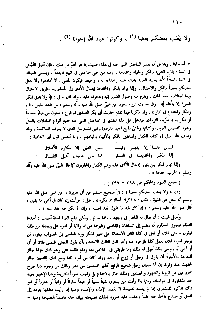 1 "ولا يغتب بعضكم بعضًا" في صحيح مسلم عن أبي هريرة، عن النبي -صلى الله عليه وآله وسلم- أنه سئل عن الغيبة، فقال: "ذكرك أخاك بما يكره" قيل: أفرأيت إن كان في أخي ما يقول، قال صلى الله عليه وسلم: "إن كان فيه ما تقول فقد اغتبته، وإن لم يكن فيه فقد بهته".