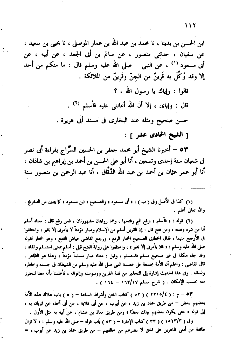 ابن الحسن بْنِ بُدَيْنَا، نا مُحَمَّدُ بْنُ عَبْدِ اللَّهِ بْنِ عماَرَ الْمَوْصِلِيُّ، نا يَحْيَى بْنُ سَعِيدٍ، عَنْ سُفْيَانَ، حَدَّثَنِي مَنْصُورٌ، عَنْ سَالِمِ بْنِ أَبِي الْجَعْدِ، عَنْ أَبِيهِ، عَنْ أَبِي مَسْعُودٍ1، عَنِ النَّبِيِّ -صَلَّى اللَّهُ عَلَيْهِ وَسَلَّمَ- قَالَ: "مَا مِنْكُمْ مِنْ أَحَدٍ إِلا وَقَدْ وُكِّل بِهِ قَرِينٌ مِنَ الْجِنِّ وَقَرِينٌ مِنَ الْمَلائِكَةِ".