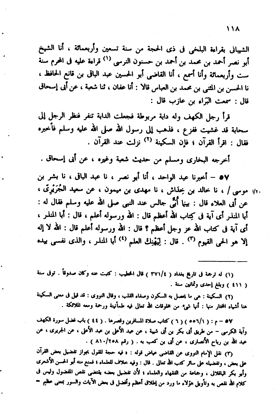 الشَّيْبَانِيُّ بِقِرَاءَةِ الْبَلْخِيِّ فِي ذِي الحجة من سنة تسعين وأربعمائة، أنا الشَّيْخُ أَبُو نَصْرٍ أَحْمَدُ بْنُ مُحَمَّدِ بْنِ أَحْمَدَ بْنِ حَسْنُونٍ النَّرْسِيُّ1 قِرَاءَةً عَلَيْهِ فِي المحرم سنة ست وأربعمائة وَأَنَا أَسْمَعُ، أنا الْقَاضِي أَبُو الْحُسَيْنِ عَبْدُ الْبَاقِي بْنُ قَانِعٍ الْحَافِظُ، نا الْحَسَنُ بْنُ الْمُثَنَّى بْنِ مُحَمَّدِ بْنِ الْعَبَّاسِ قَالا: أنا عَفَّانُ، ثنا شُعْبَةُ، عَنْ أَبِي إِسْحَاقَ قَالَ: سَمِعْتُ الْبَرَاءَ بْنَ عَازِبٍ قَالَ: