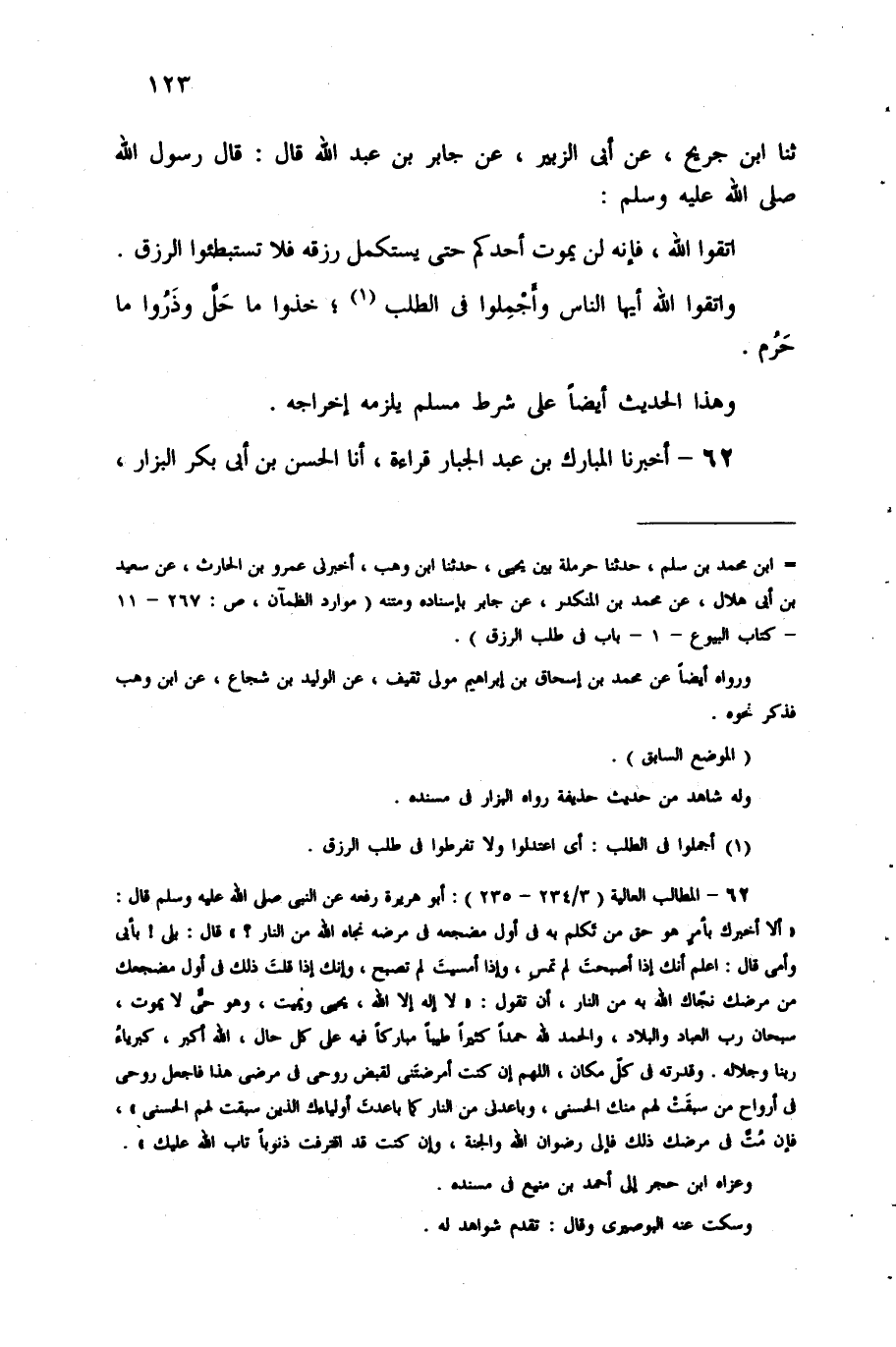 = لكن لم ينفرد ابن ماجه بإخراجه من هذا الوجه، فقد روى ابن حبان في صحيحه عن عَبْدِ اللَّهِ بْنِ مُحَمَّدِ بْنِ سلم، حدثنا حرملة بن يحيى، حدثنا ابن وهب، أخبرني عمرو بن الحارث، عن سعيد بن أبي هلال، عن محمد بن المنكدر، عن جابر بإسناده ومتنه "موارد الظمآن، ص267 - "11" كتاب البيوع - "1" باب في طلب الرزق".
